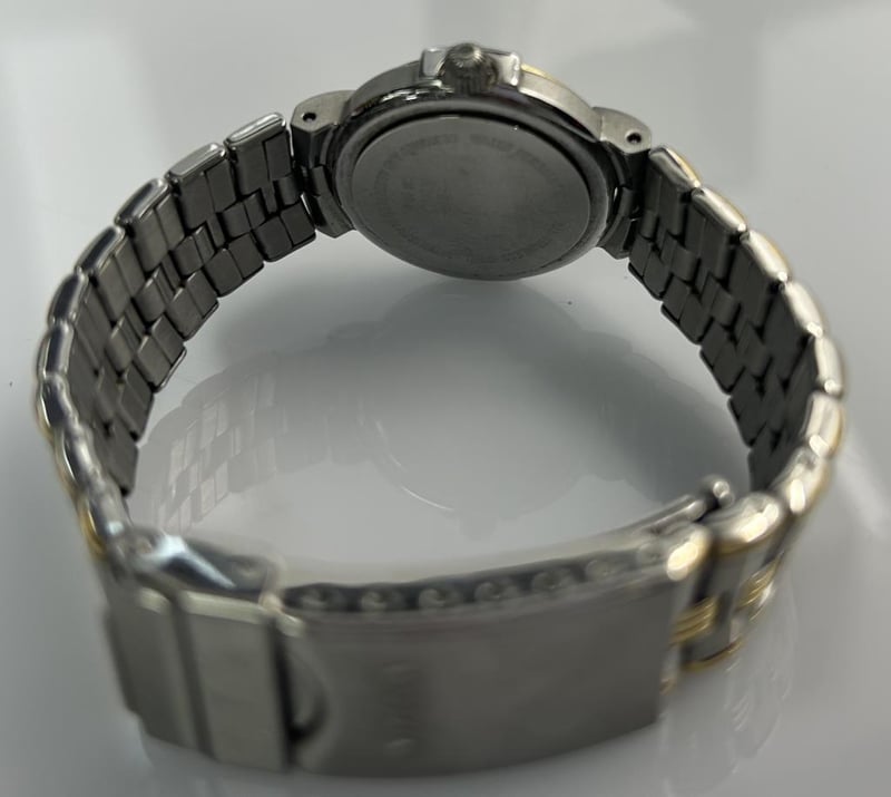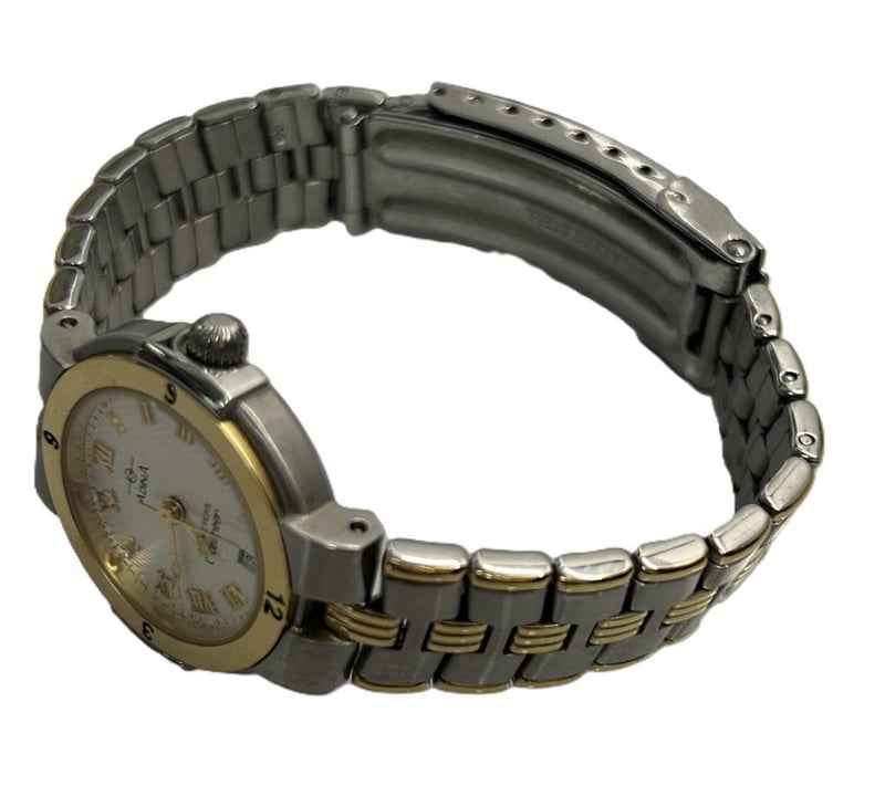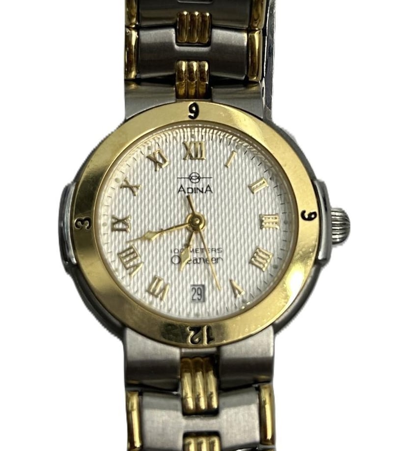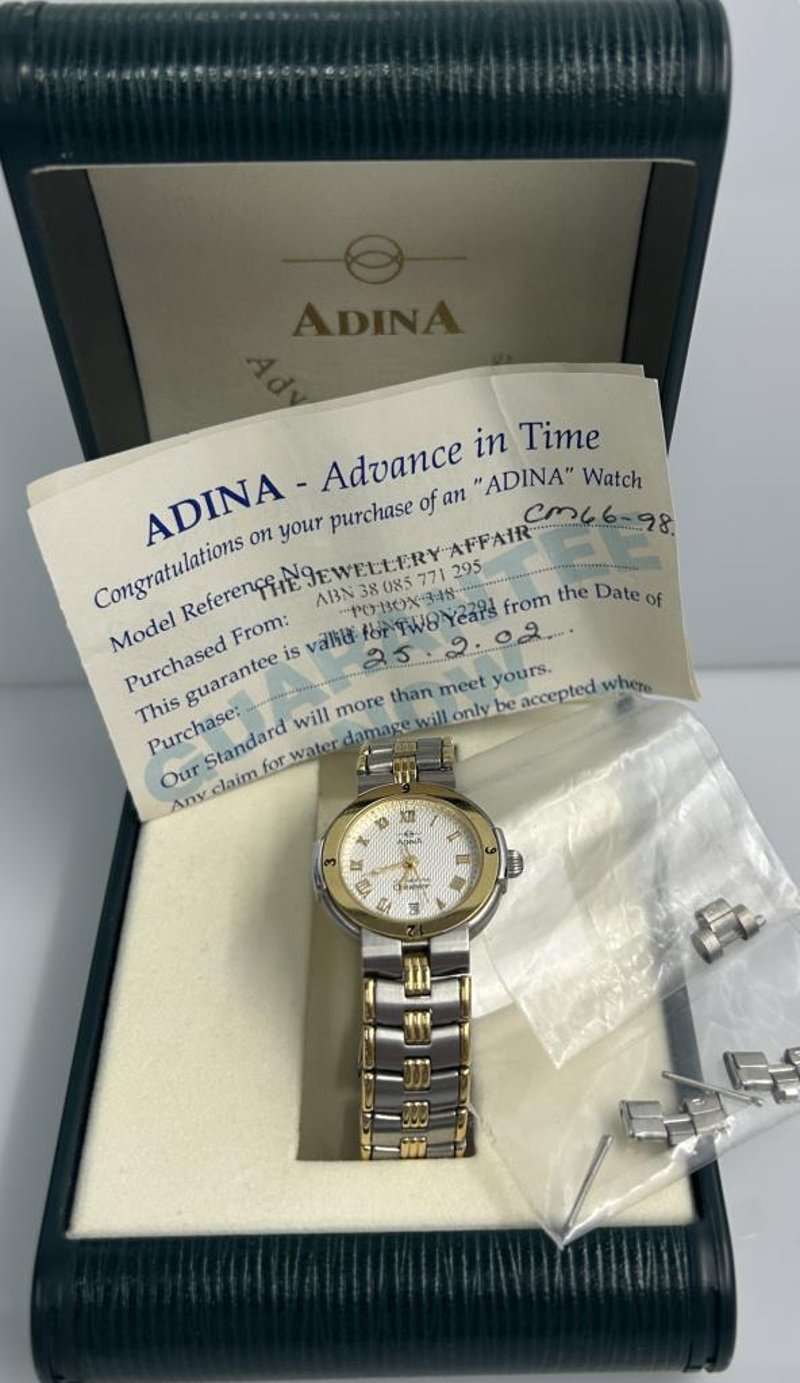 ADINA OCEANEER TWO-TONE WATCH, STAINLESS STEEL AND GOLD-TONE CASE 26MM, WHITE TEXTURED DIAL WITH GOLD ROMAN NUMERALS AND DATE DISPLAY, QUARTZ MOVEMENT, WATER RESISTANT TO 100M, SAPPHIRE CRYSTAL, TWO-TONE STAINLESS STEEL BRACELET WITH FOLDING CLASP, INCLUDES ORIGINAL ADINA BOX, CARD DATED 2002, AND SPARE LINKS, LIGHT SURFACE WEAR CONSISTENT WITH AGE.Condition: Good - Refer To Images