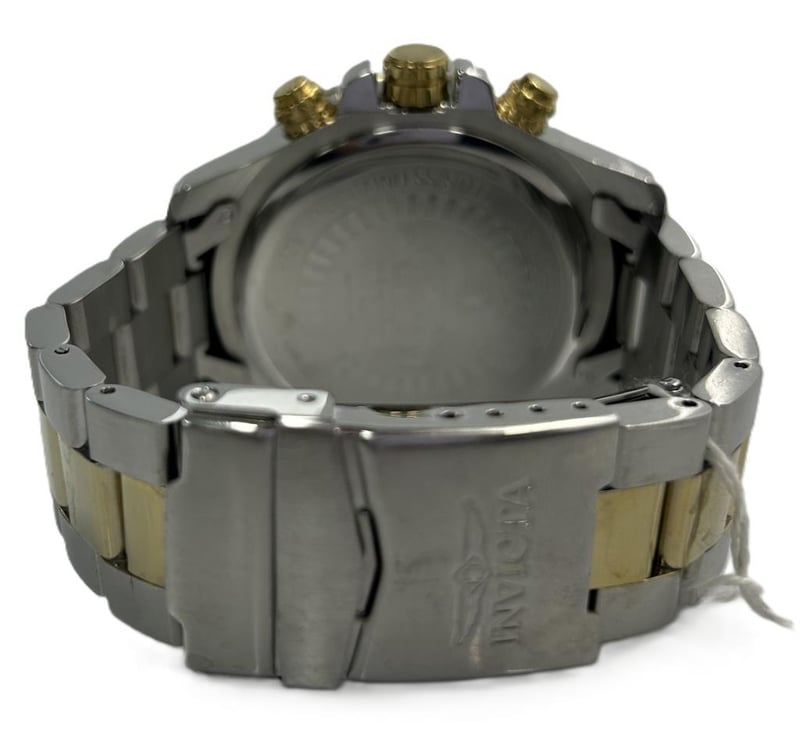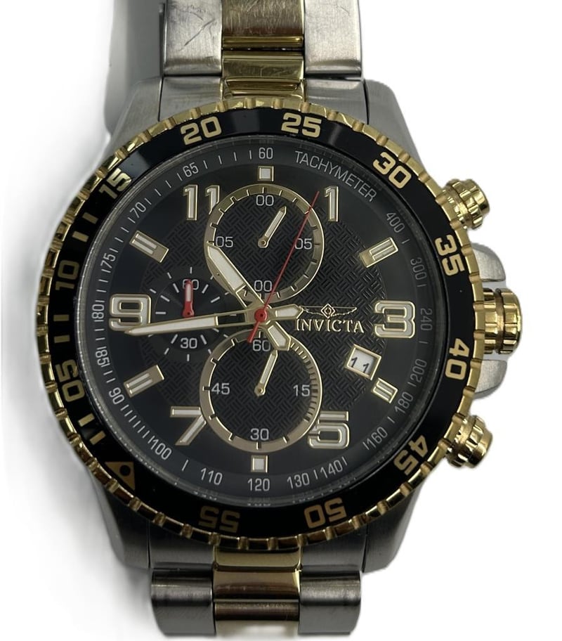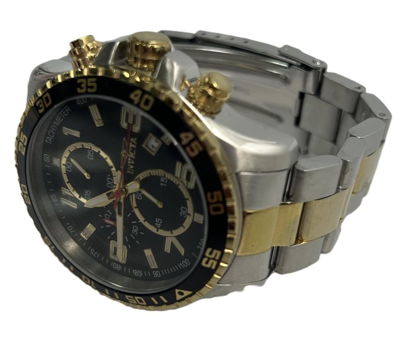 INVICTA CHRONOGRAPH BLACK DIAL WATCH, BLACK DIAL WITH GOLD SUBDIALS AND ACCENTS, LUMINOUS HANDS AND MARKERS, TACHYMETER BEZEL, DATE DISPLAY, TWO-TONE STAINLESS STEEL CASE AND BRACELET WITH GOLD CENTRE LINKS, QUARTZ CHRONOGRAPH MOVEMENT, CASE DIAMETER 45MM, WATER RESISTANT TO 100M, FOLD-OVER CLASP WITH SAFETY, GOOD CONDITION WITH MINIMAL WEARCondition: Good - Refer To Images