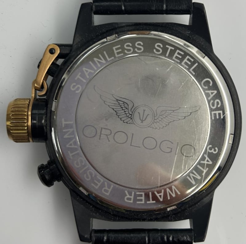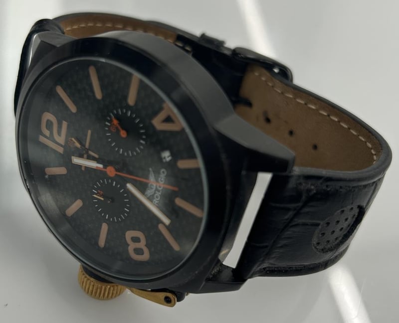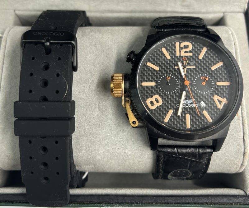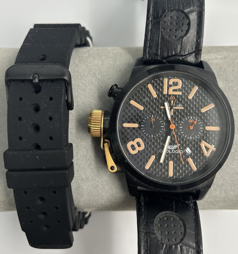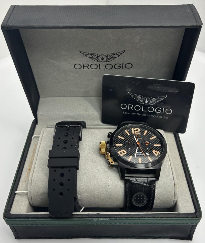 OROLOGIO CARBON CHRONOGRAPH WATCH, BLACK CARBON-FIBRE DIAL WITH ORANGE INDICES AND SUBDIALS, CASE MEASURES 55MM, WR 3 ATM, QUARTZ MOVEMENT, BLACK STAINLESS STEEL CASE WITH GOLD-TONE CROWN GUARD, INTERCHANGEABLE BLACK LEATHER AND RUBBER STRAPS, INCLUDES ORIGINAL OROLOGIO BOX, CARD, AND SPARE STRAP.Condition: Good - Refer To Images