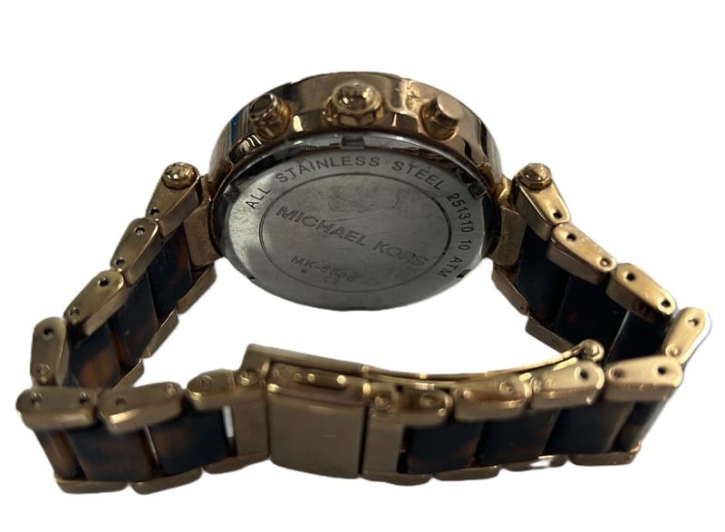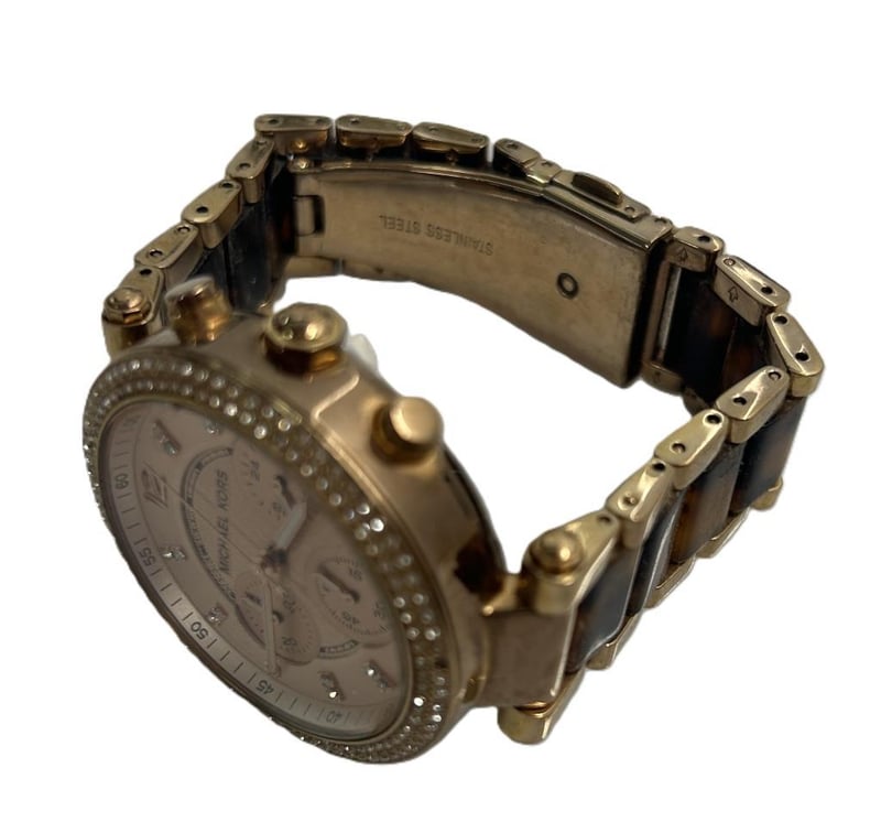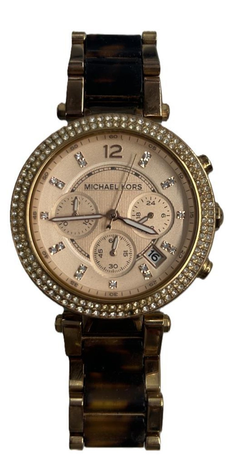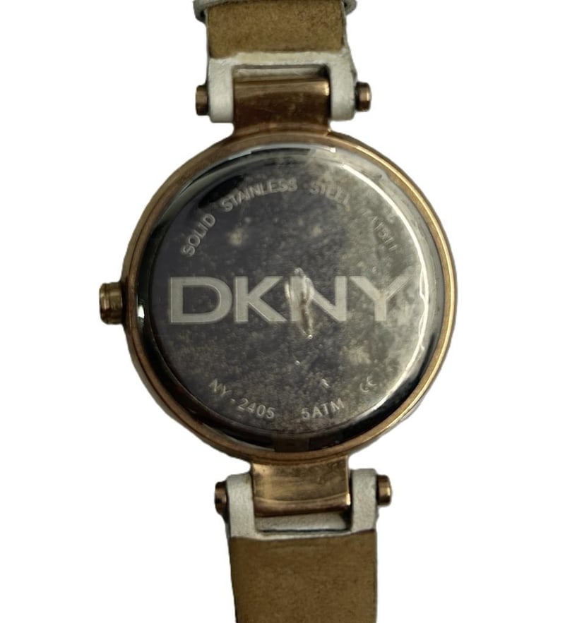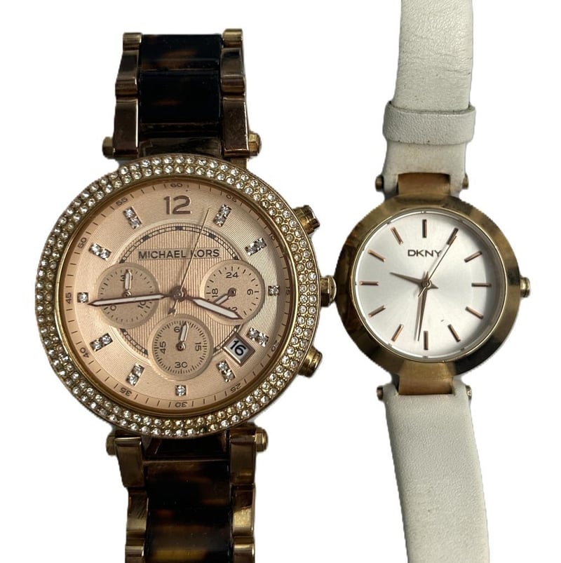 1 X DKNY QUARTZ WATCH, MODEL NY2405, SILVER SUNRAY DIAL WITH ROSE GOLD-TONE HANDS AND INDEX HOUR MARKERS. HOUSED IN A ROSE GOLD-TONE STAINLESS STEEL CASE WITH SOLID CASE BACK AND FITTED TO A WHITE GENUINE LEATHER STRAP. POWERED BY A QUARTZ MOVEMENT WITH 5 ATM WATER RESISTANCE. LIGHT WEAR CONSISTENT WITH GENTLE USE. 1 X MICHAEL KORS CHRONOGRAPH WATCH, MODEL MK5838, ROSE GOLD-TONE DIAL WITH CRYSTAL HOUR MARKERS, THREE SUB-DIALS FOR CHRONOGRAPH AND 24-HOUR DISPLAY, AND A DATE WINDOW AT 4 O’CLOCK. SET WITHIN A CRYSTAL-SET BEZEL (1 MISSING) AND ROSE GOLD-TONE STAINLESS STEEL CASE, COMPLETED BY A TORTOISESHELL-ACCENTED BRACELET. QUARTZ CHRONOGRAPH MOVEMENT WITH 10 ATM WATER RESISTANCE. MODERATE WEAR CONSISTENT WITH REGULAR USE.