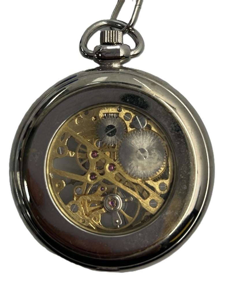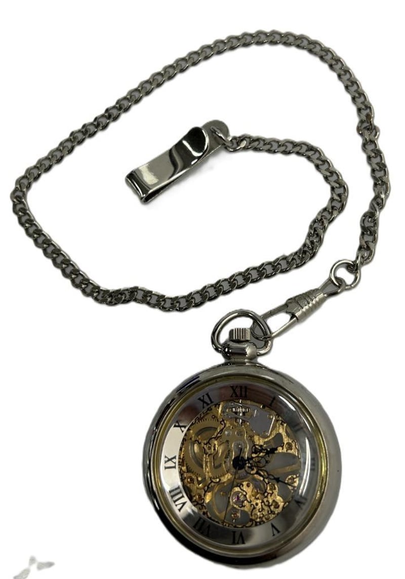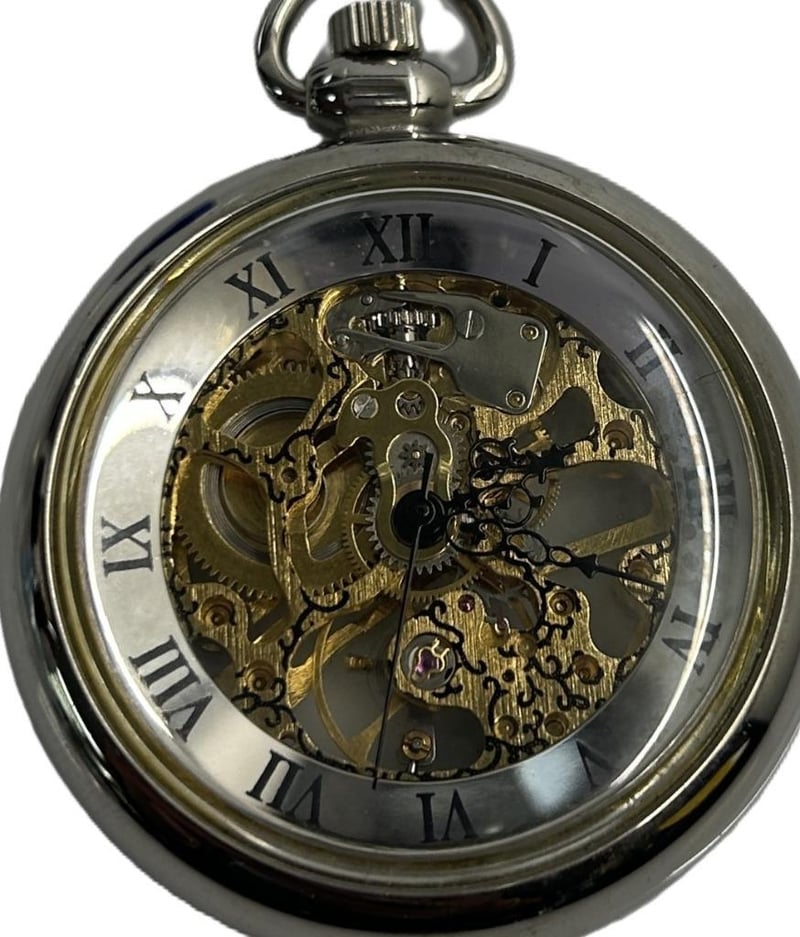 MECHANICAL SKELETON POCKET WATCH WITH ROMAN NUMERAL DIAL AND VISIBLE GOLD-TONE MOVEMENT. FEATURES SEE-THROUGH CASE FRONT AND BACK, SILVER-TONE BODY, AND MATCHING CHAIN WITH CLIP. ELEGANT STEAMPUNK DESIGN, MANUALLY WOUND.