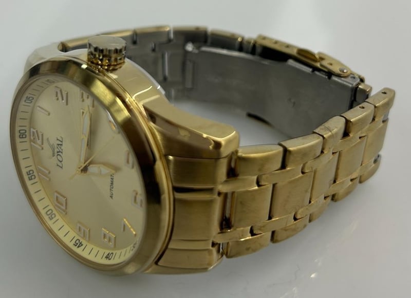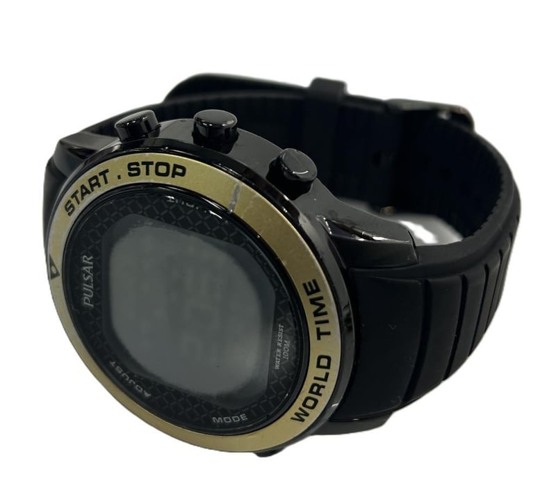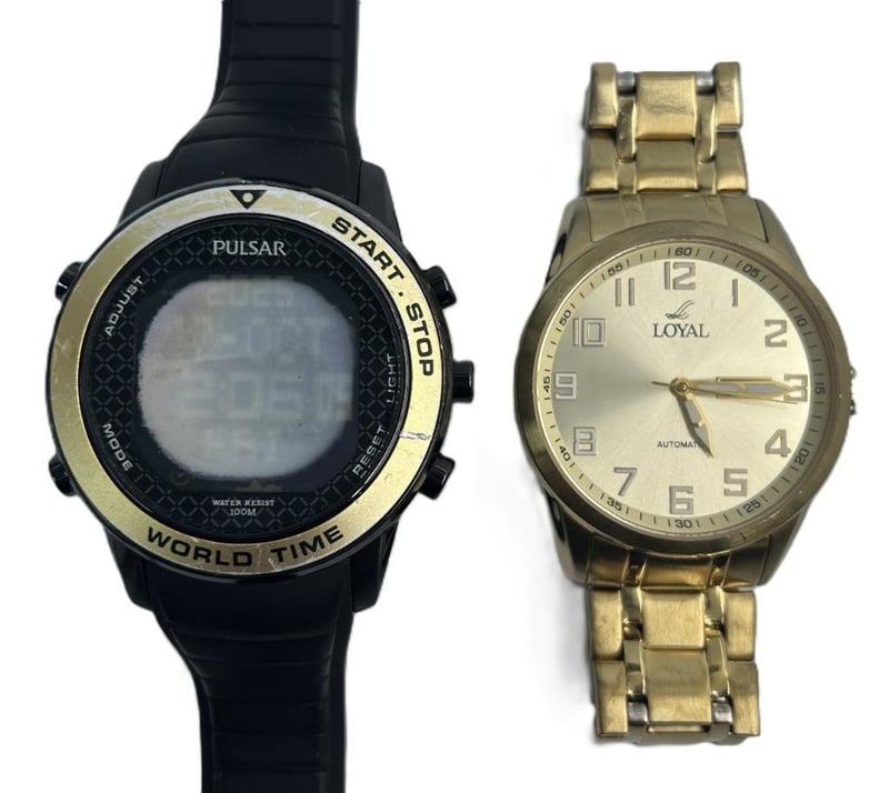 1 X LOYAL AUTOMATIC WATCH, MODEL F024, CHAMPAGNE DIAL WITH LUMINOUS ARABIC NUMERAL HOUR MARKERS AND MATCHING GOLD-TONE HANDS, TWO-TONE STAINLESS STEEL CASE AND BRACELET, WITH POLISHED FINISH AND EXHIBITION CASE BACK. POWERED BY A SELF-WINDING AUTOMATIC MOVEMENT. LIGHT WEAR CONSISTENT WITH GENTLE USE. 1 X PULSAR DIGITAL CHRONOGRAPH WATCH, MODEL YPDA-WR10BA, DIGITAL DISPLAY WITH MULTIPLE FUNCTIONS INCLUDING CHRONOGRAPH, ALARM, WORLD TIME, AND BACKLIGHT. DESIGNED WITH A BLACK RESIN CASE, GOLD-TONE BEZEL, AND MATCHING BLACK RUBBER STRAP. WATER RESISTANT TO 100 M (10 BAR). MODERATE COSMETIC WEAR CONSISTENT WITH LIGHT USE.