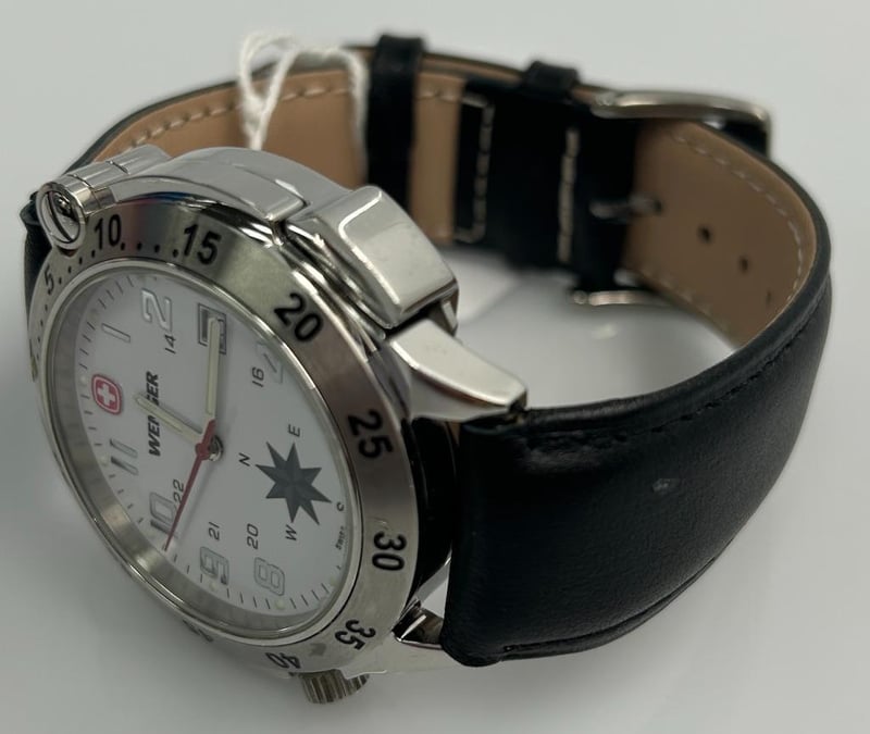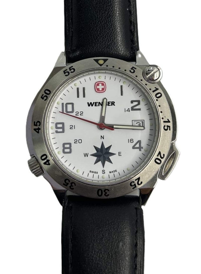 WENGER SWISS MILITARY COMPASS WATCH, WHITE DIAL WITH LUMINOUS HANDS AND MARKERS, DATE DISPLAY AT 3 O’CLOCK, 44MM CASE, INTERNAL COMPASS FEATURE ON CASE BACK, ROTATING BEZEL, SWISS QUARTZ MOVEMENT, BLACK LEATHER STRAP WITH BUCKLE CLASP, WATER RESISTANT TO 100M, EXCELLENT CONDITION WITH MINIMAL WEAR.Condition: Good - Refer To Images997339+150