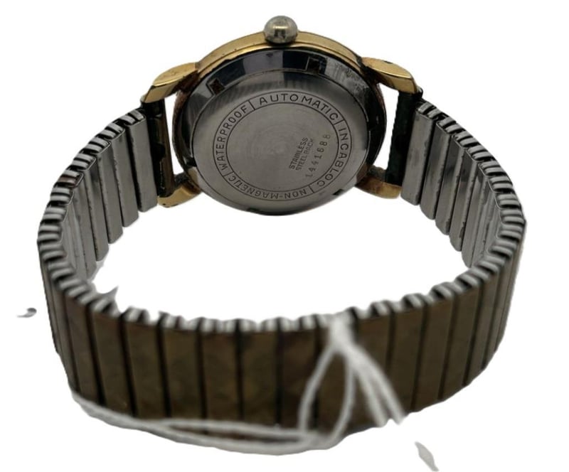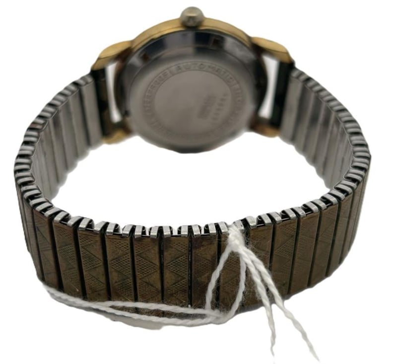 NIVADA WATERPROOF AUTOMATIC 17 JEWELS VINTAGE WATCH, GOLD-TONE DIAL WITH NUMERICAL/POINTED BATON HOUR MARKERS, CASE MEASURES 34MM, SWISS MADE, INCABLOC AUTOMATIC MOVEMENT, WATERPROOF/NON MAGNETIC, BRASS-TONE (GOLD PLATING WORN OFF) STAINLESS STEEL STRETCH BRACELET, CIRCA 1960'S.Condition: Good - Refer To Images997339+153