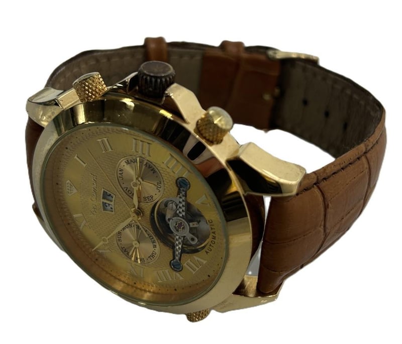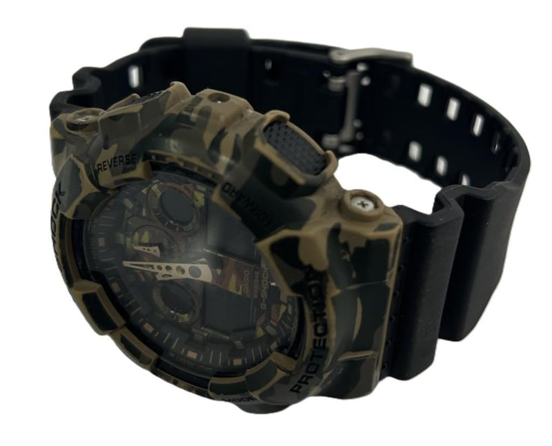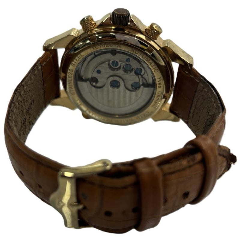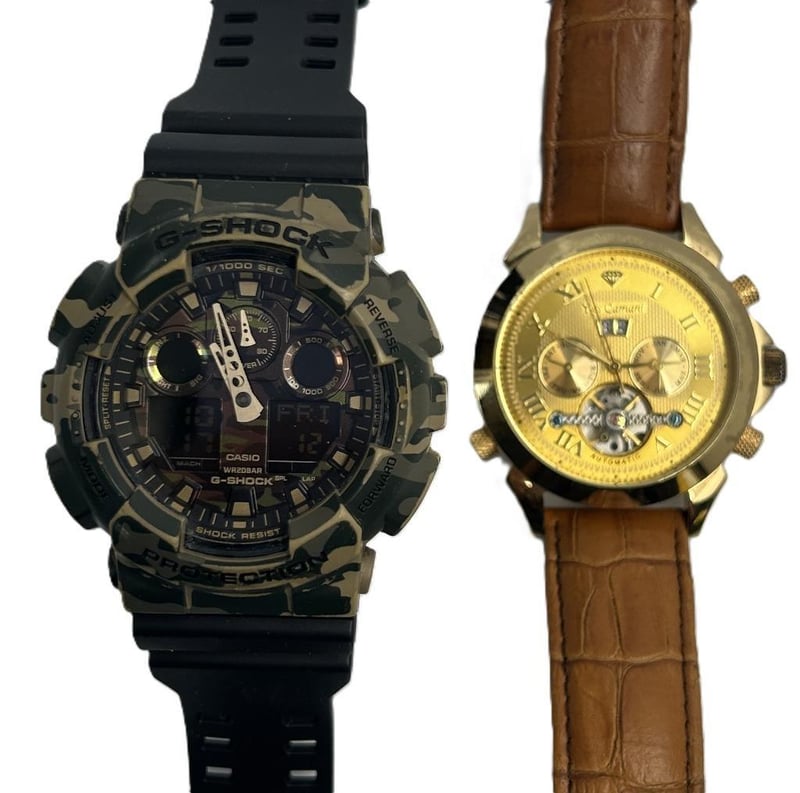 1 X YVES CAMANI AUTOMATIC WATCH, MODEL YC1020-A, CHAMPAGNE DIAL WITH ROMAN NUMERAL HOUR MARKERS, OPEN-HEART BALANCE WHEEL, DUAL SUB-DIALS FOR MONTH AND DAY, AND A DATE DISPLAY WINDOW. PRESENTED IN A GOLD-TONE STAINLESS STEEL 44 MM CASE WITH EXHIBITION CASE BACK AND BROWN CROCODILE-EMBOSSED LEATHER STRAP. POWERED BY AN AUTOMATIC MOVEMENT. LIGHT WEAR CONSISTENT WITH GENTLE USE, 1 X CASIO G-SHOCK CAMOUFLAGE CHRONOGRAPH WATCH, MODEL GA-100CF, BLACK AND GREEN CAMOUFLAGE DIAL WITH BOTH ANALOGUE AND DIGITAL DISPLAYS, LUMINOUS HANDS, AND MULTIPLE SUB-DIALS INCLUDING STOPWATCH, TIMER, AND WORLD TIME. CONSTRUCTED FROM RESIN CASE AND STRAP WITH STAINLESS STEEL CASE BACK, SHOCK-RESISTANT DESIGN, AND 200 M WATER RESISTANCE. MINIMAL WEAR CONSISTENT WITH GENTLE USE.