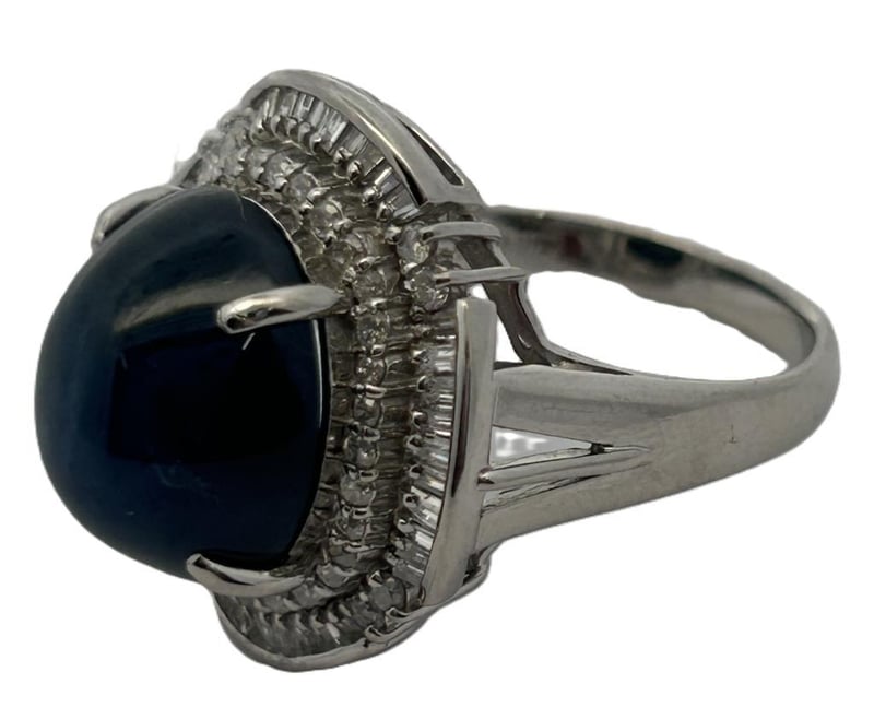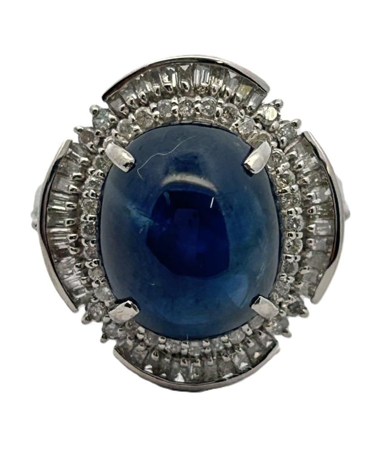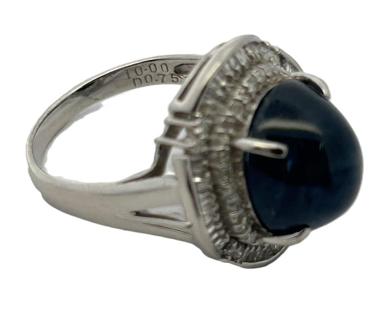 PLATINUM 10.0CT BLUE STAR SAPPHIRE & 0.75CT DIAMOND HALO RING, OVAL CABOCHON CUT SAPPHIRE 13.0X 11.0MM 4 CLAW SET SURROUNDED BY 31 ROUND BRILLIANT CUT DIAMONDS CUT DOWN CLAW SET WITH AN OUTER ROW OF 42 TAPERED BAGUETTE & 8 ROUND BRILLIANT CUT DIAMONDS, TOTAL DIAMOND WEIGHT 0.75CT, STAMP PT900, RING WEIGHT 9.48 GRAMS. THIS ITEM HAS BEEN PROFESSIONALLY VERIFIED AS A GENUINE PRODUCT AND COMES WITH ACCOMPANYING 3RD PARTY CERTIFICATE OF AUTHENTICITY