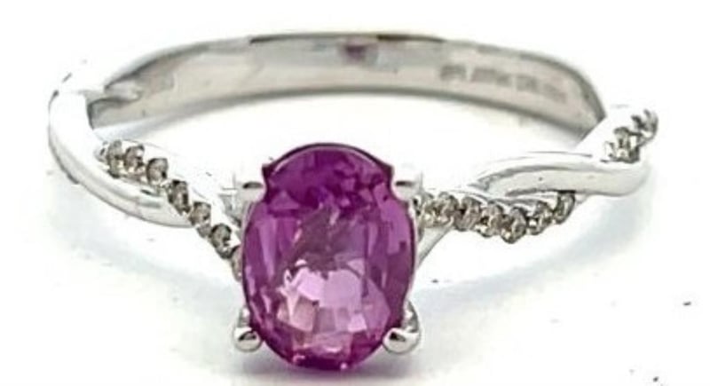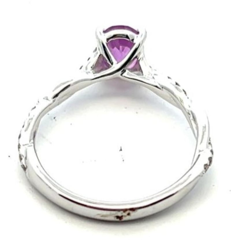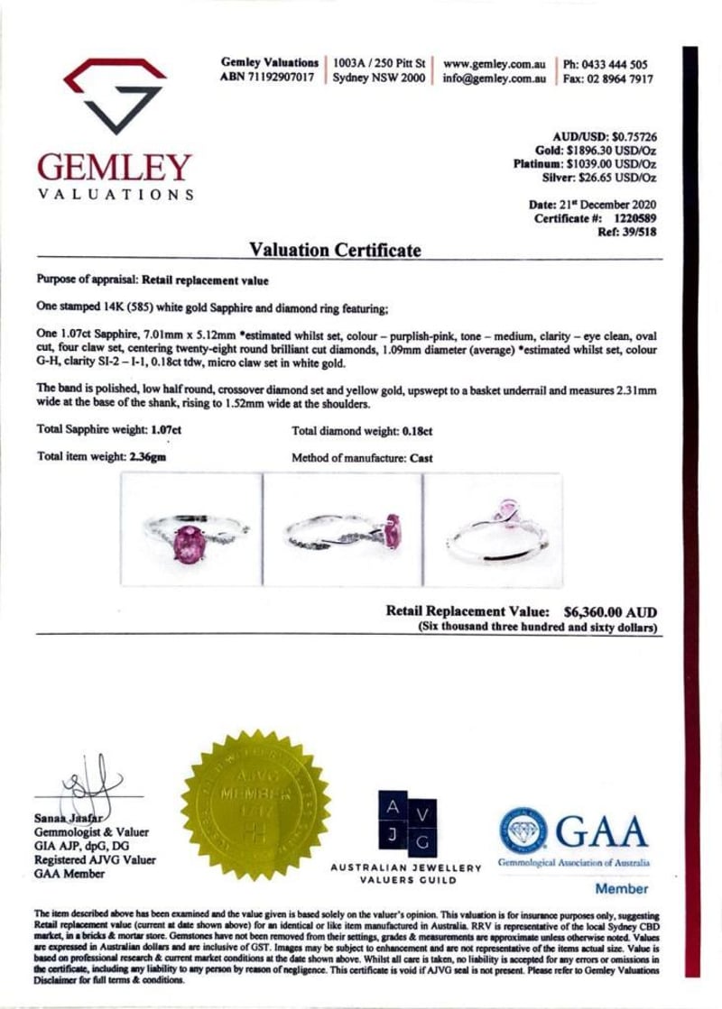 14CT WHITE GOLD 1.07 PINK SAPPHIRE & DIAMOND RING, OVAL PURPLISH PINK SAPPHIRE 4 CLAW SET WITH 14 ROUND BRILLIANT CUT DIAMONDS MICRO CLAW SET IN EACH TWIST SHOULDER, TOTAL DIAMOND WEIGHT 0.18CT G-H SI2, STAMP 585, RING WEIGHT 2.34GRAMS. THIS ITEM HAS BEEN PROFESSIONALLY VERIFIED AS A GENUINE PRODUCT AND COMES WITH ACCOMPANYING 3RD PARTY VALUATION $6,360.00