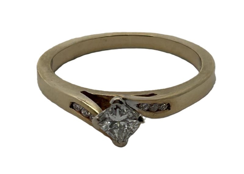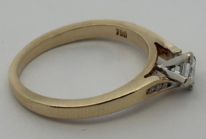 18CT YELLOW GOLD 0.30CT DIAMOND RING, CENTRE PRINCESS CUT DIAMONDS CORNER CAP SET WITH 3 ROUND BRILLIANT CUT DIAMONDS CHANNEL SET IN EACH SWEPT UP CURVE POINTED SHOULDER ON A 1.70MM QUARTER ROUND BAND, ESTIMATE TOTAL DIAMOND WEIGHT 0.30CT, STAMP 750, RING WEIGHT 3.10 GRAMS. THIS ITEM HAS BEEN PROFESSIONALLY VERIFIED AS A GENUINE PRODUCT AND COMES WITH ACCOMPANYING 3RD PARTY CERTIFICATE OF AUTHENTICITYCondition: Good - Refer To Images