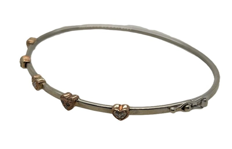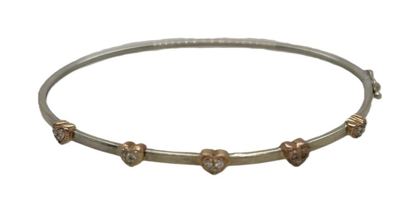 9CT YELLOW/ROSE GOLD DIAMOND HEART BANGLE, 5 GROUPS OF THREE ROUND BRILLIANT CUT DIAMONDS GRAIN SET IN ROSE GOLD HEART, ESTIMATE TOTAL DIAMOND WEIGHT 0.10CT, STAMP 9K, BANGLE DIAMETER MEASURES 6X5CM, TOTAL WEIGHT 3.18 GRAMS, CONCEALED BOX CLOSURE WITH FIGURE 8 SAFETY LATCH. THIS ITEM HAS BEEN PROFESSIONALLY VERIFIED AS A GENUINE PRODUCT AND COMES WITH ACCOMPANYING 3RD PARTY CERTIFICATE OF AUTHENTICITY.Condition: Good - Refer To Images