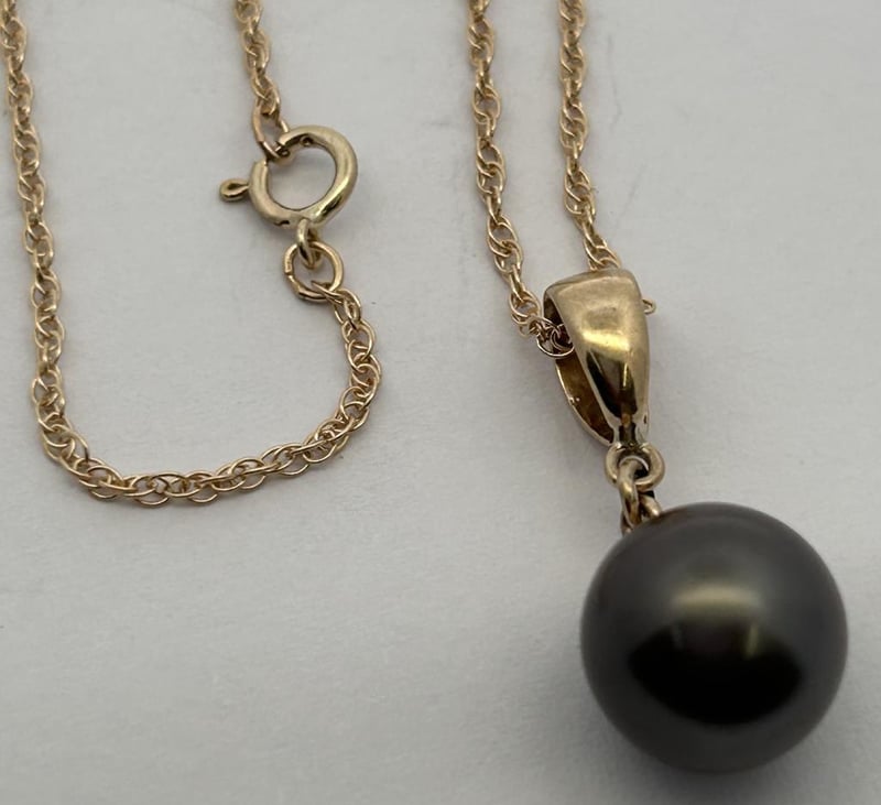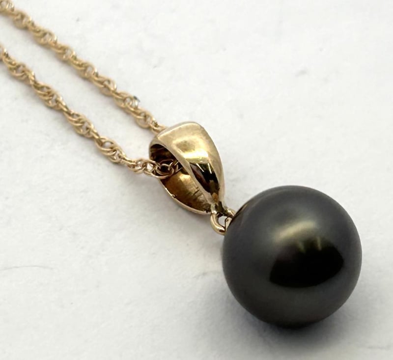 9CT YELLOW GOLD TAHITIAN PEARL PENDANT WITH 14CT GOLD NECKLACE, 10.2MM ROUND PEARL STEM SET WITH GOLD BALE WITH SINGAPORE LINK CHAIN WITH BOLT CLASP, NECKLACE LENGTH 40CM, STAMP 375/14K , TOTAL WEIGHT 4.5 GRAMS. THIS ITEM HAS BEEN PROFESSIONALLY VERIFIED AS A GENUINE PRODUCT AND COMES WITH ACCOMPANYING 3RD PARTY CERTIFICATE OF AUTHENTICITY