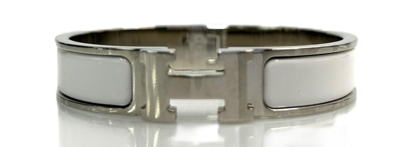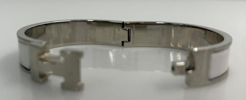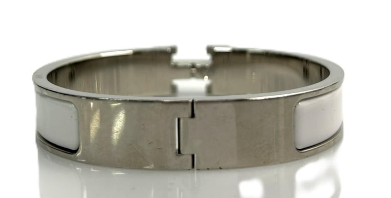 HERMES CLIC H BRACELET, SILVER-TONE WITH WHITE ENAMEL INLAY, BRACELET MEASURES INSIDE W5.5 X H4.5CM, MADE IN FRANCE. NB: THERE ARE SOME EXTERNAL LIGHT SCRATCHES ON THE H TURN LOCK AND THE BASE.Condition: Good - Refer To Images