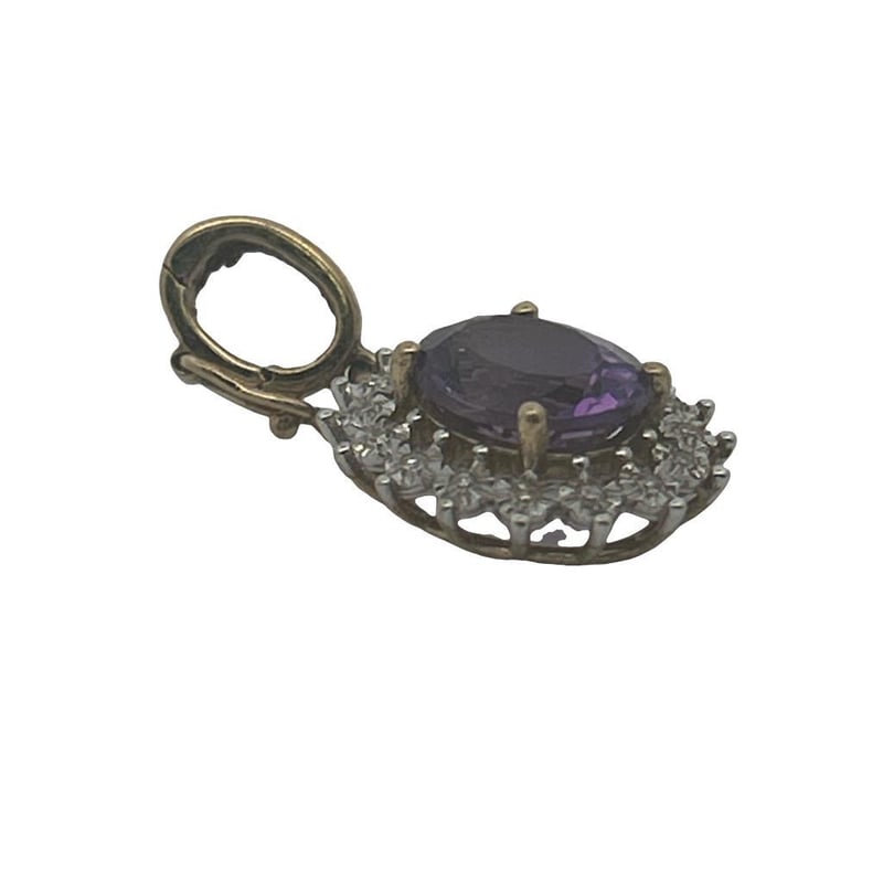 9CT YELLOW GOLD AMETHYST & DIAMOND CLUSTER ENHANCER PENDANT, OVAL CUT AMETHYST 9.6X7.6MM 4 CLAW SET SURROUNDED BY 16 ROUND BRILLIANT CUT DIAMONDS ILLUSION SET, ESTIMATE TOTAL DIAMOND WEIGHT 0.14CT, PENDANT MEASURES 27X14MM INCLUDING BALE, TOTAL WEIGHT 2.29 GRAMS, STAMP 375. THIS ITEM HAS BEEN PROFESSIONALLY VERIFIED AS A GENUINE PRODUCT AND COMES WITH ACCOMPANYING 3RD PARTY CERTIFICATE OF AUTHENTICITYCondition: Good - Refer To Images