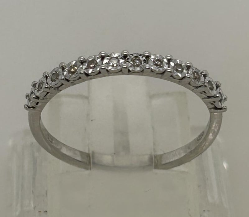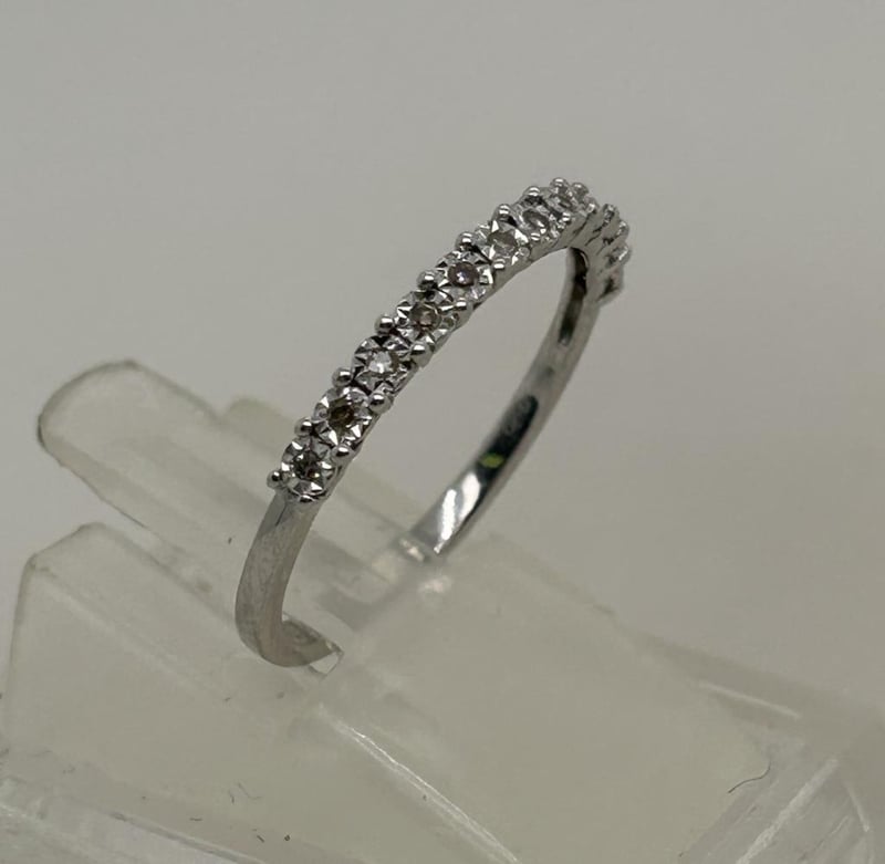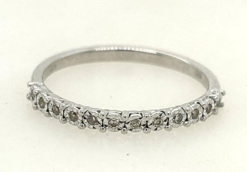 9CT WHITE GOLD DIAMOND BAND, 12 ROUND BRILLIANT CUT DIAMONDS ILLUSION SET IN ROW, TOTAL DIAMOND WEIGHT 0.06CT (ESTIMATE), STAMP 375, RING WEIGHT 1.35 GRAMS, 1.53MM 1/2 ROUND BAND. THIS ITEM HAS BEEN PROFESSIONALLY VERIFIED AS A GENUINE PRODUCT AND COMES WITH ACCOMPANYING 3RD PARTY CERTIFICATE OF AUTHENTICITYCondition: Good - Refer To Images