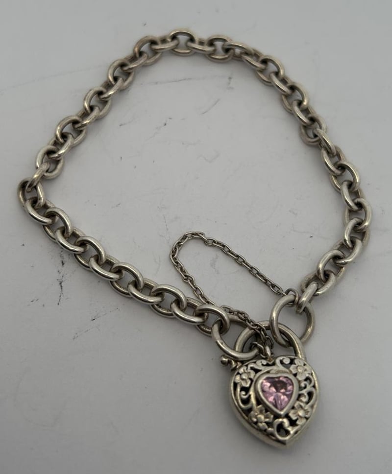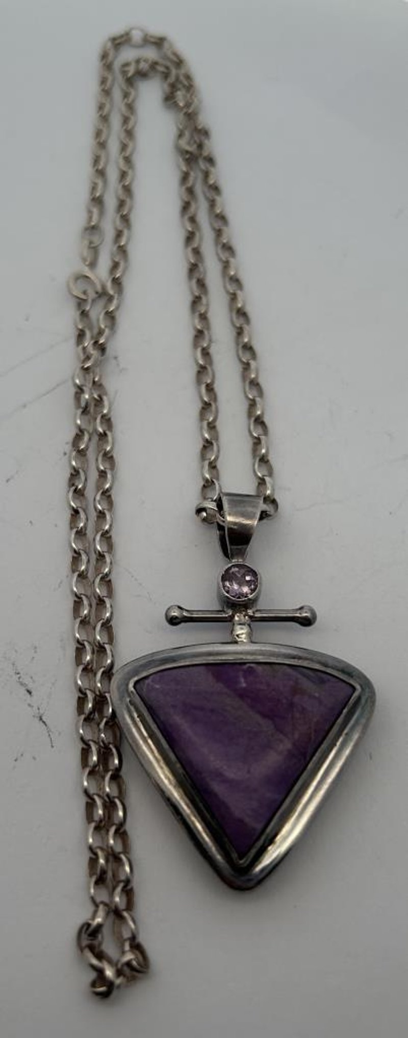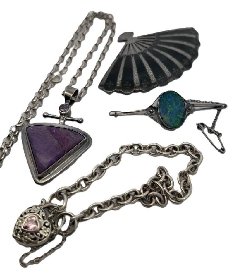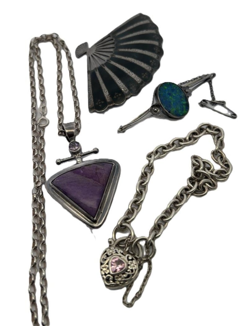 STERLING SILVER JEWELLERY LOT, COMPRISING A TRIANGULAR AMETHYST PENDANT ON A SILVER CHAIN WITH CROSS-STYLE BAIL, A PINK HEART LOCKET BRACELET WITH DECORATIVE LINK CHAIN, A BLUE-GREEN OPAL DOUBLET BROOCH IN AN OVAL BEZEL SETTING, AND A BLACK ENAMEL FAN-SHAPED BROOCH WITH ETCHED SILVER DETAILING. ALL PIECES ARE CRAFTED IN STERLING SILVER, TESTED AND MARKED 925 STERLING, WITH MINOR WEAR CONSISTENT WITH AGE AND SECURE STONES AND CLASPS. A TOTAL COMBINED WEIGHT 74.0 GRAMS.Condition: Good - Refer To Images