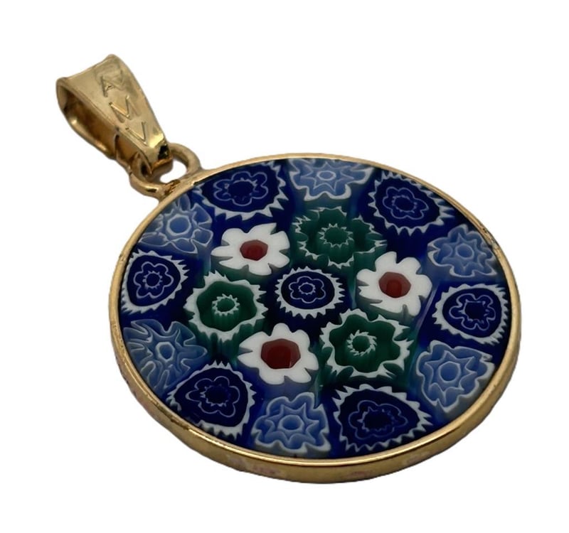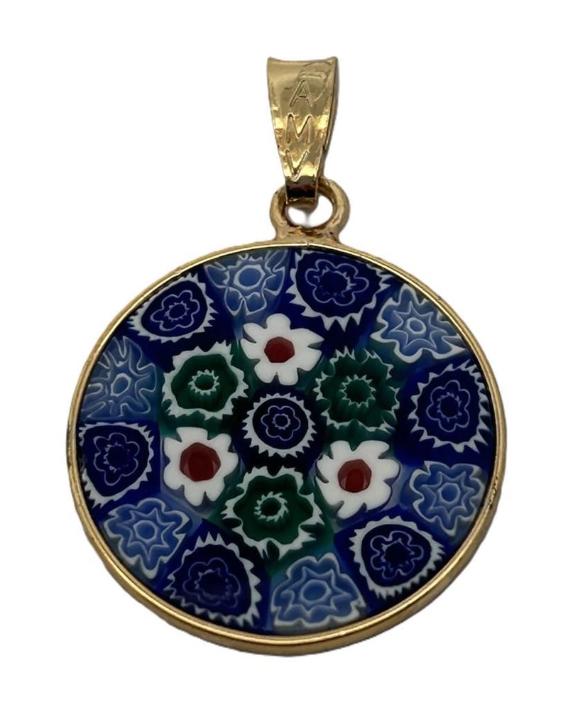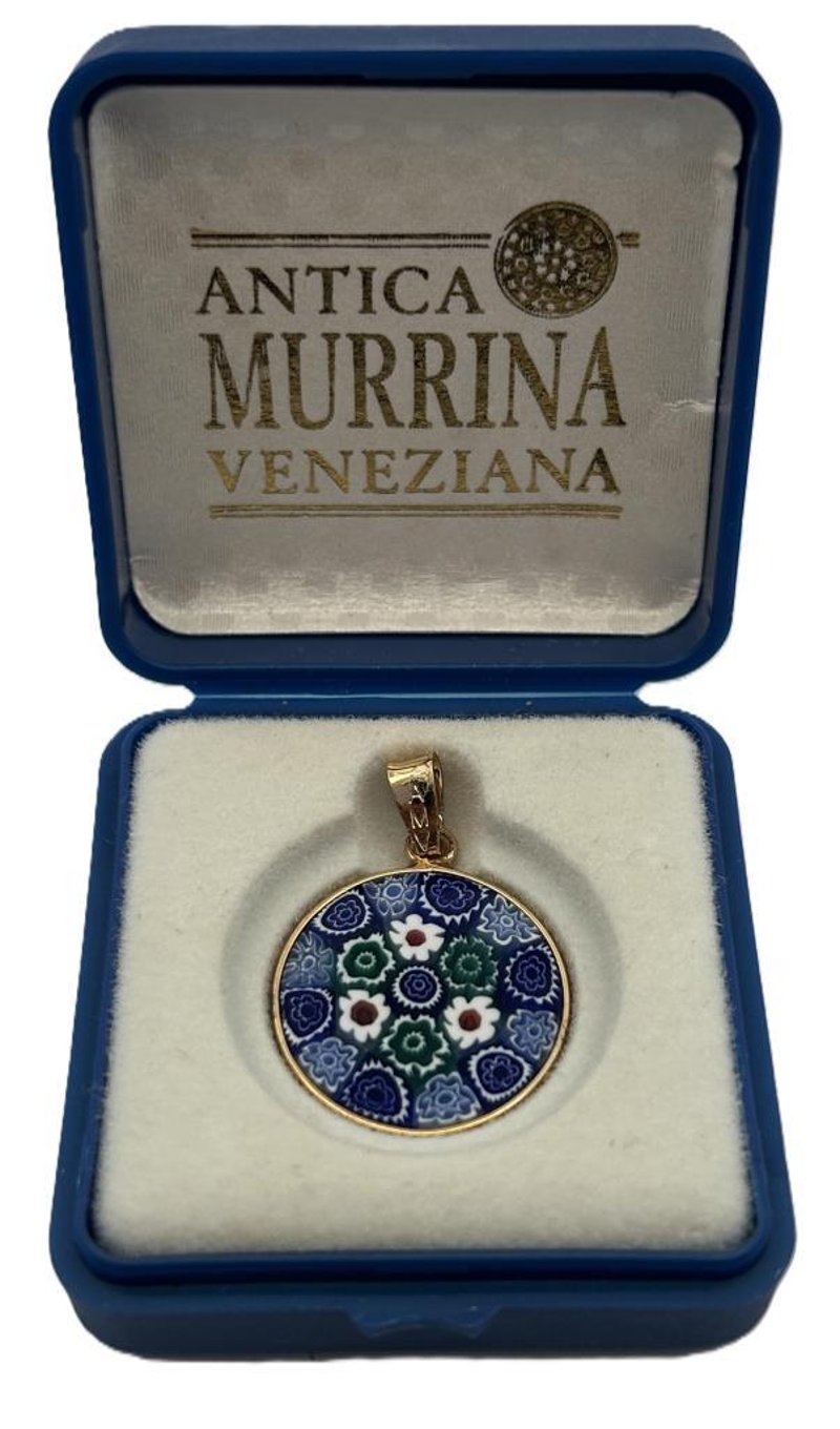ANTICA MURRINA VENEZIANA PENDANT, CRAFTED IN ITALY AND FEATURING A ROUND MILLEFIORI GLASS DESIGN IN VIBRANT SHADES OF BLUE, GREEN, WHITE, AND RED, FRAMED IN A YELLOW GOLD-TONE BEZEL WITH MATCHING BAIL. THE INTRICATE FLORAL MOSAIC PATTERN EXEMPLIFIES TRADITIONAL VENETIAN GLASS ARTISTRY. PRESENTED IN ITS ORIGINAL ANTICA MURRINA VENEZIANA BOX.Condition: Good - Refer To Images