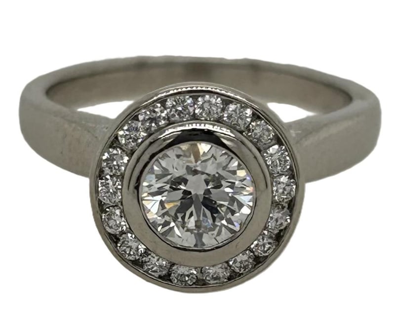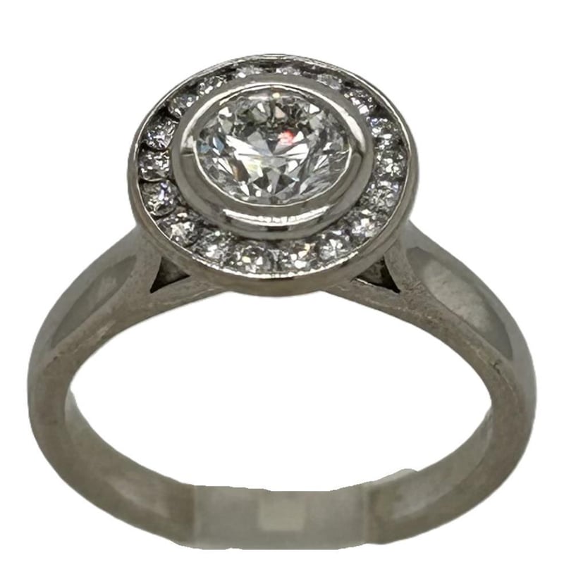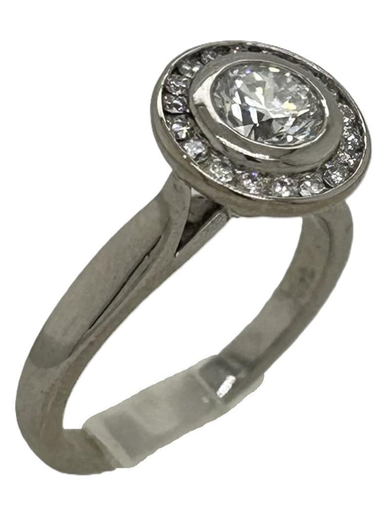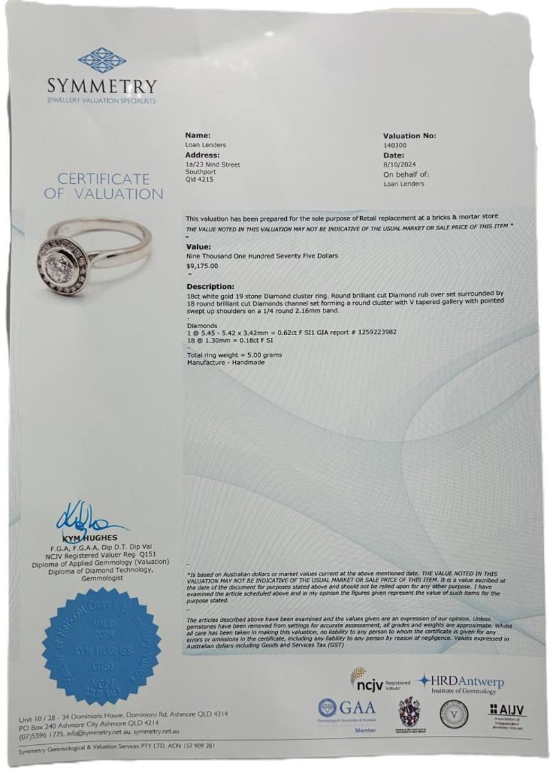 18CT WHITE GOLD 0.80CT DIAMOND CLUSTER RING, CENTRE 0.62CT ROUND BRILLIANT CUT DIAMOND F SI1 (GIA REPORT) RUB OVER SET SURROUNDED BY 18 ROUND BRILLIANT CUT DIAMOND CHANNEL SET FORMING A ROUND CLUSTER WITH V TAPERED GALLERY, TOTAL DIAMOND WEIGHT 0.80CT F SI-SI1, RING WEIGHT 5.00 GRAMS. THIS ITEM HAS BEEN PROFESSIONALLY VERIFIED AS A GENUINE PRODUCT AND COMES WITH ACCOMPANYING 3RD PARTY VALUATION $9,175.00Condition: Good - Refer To Images