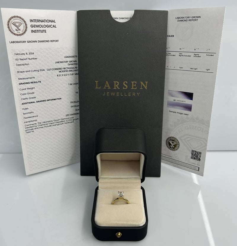 18CT YELLOW GOLD 1.54CT DIAMOND SOLITARE RING, CUT CORNERED RECTANGULAR MODIFIED BRILLIANT LABORATORY DIAMONDS 4 CLAW SET, TOTAL DIAMOND WEIGHT 1.54CT F VS2, STAMP 750, RING WEIGHT 4.4 GRAMS, HALF ROUND 2.33MM BAND. THIS ITEM HAS BEEN PROFESSIONALLY VERIFIED AS A GENUINE PRODUCT AND COMES WITH ACCOMPANYING 3RD PARTY CERTIFICATE OF AUTHENTICITY & IGI LABORATORY REPORT.