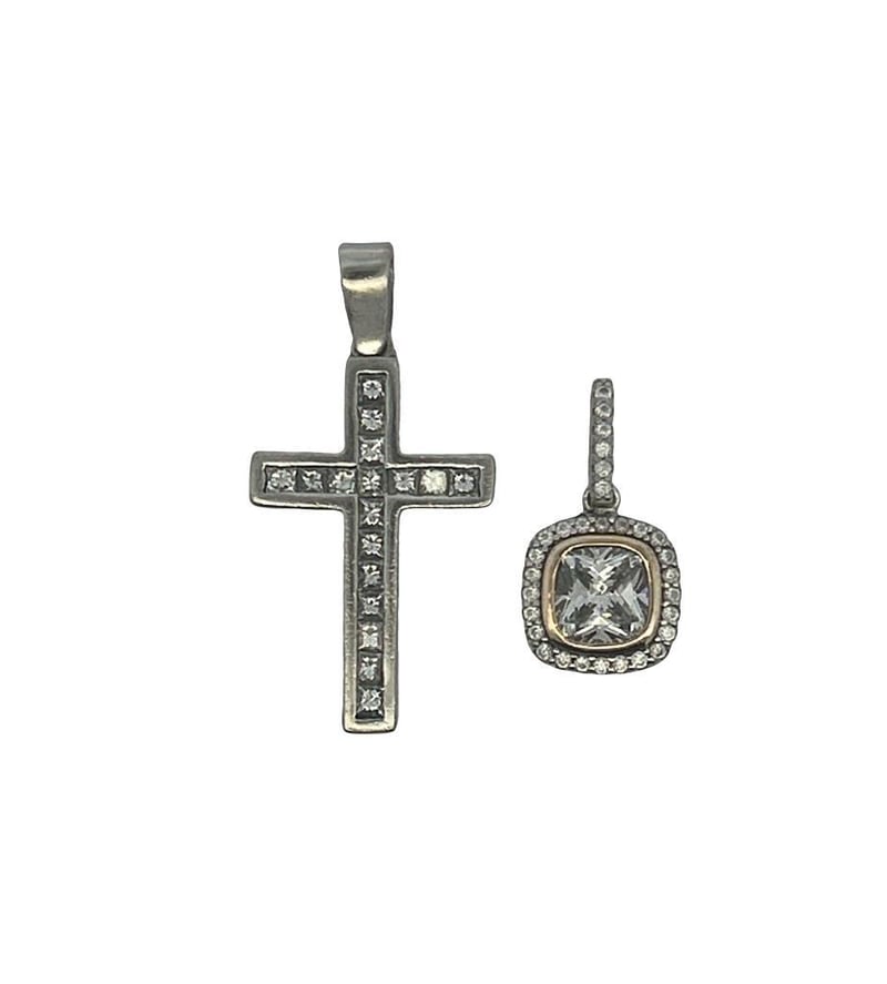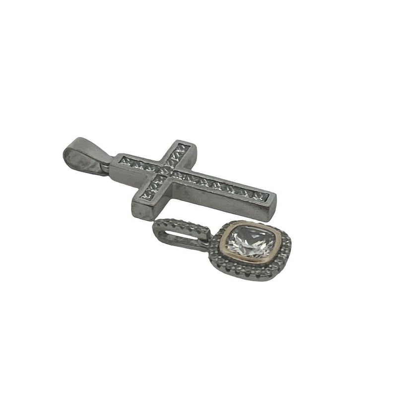 14CT WHITE GOLD CROSS 0.85CT DIAMOND PENDANT & STERLING SILVER CUBIC ZIRCONIA PENDANT. GOLD CROSS INCLUDES 17 PRINCESS CUT DIAMONDS CHANNEL SET, ESTIMATE TOTAL DIAMOND WEIGHT 0.85CT, XRF GOLD TEST, PENDANT WEIGHT 6.91 GRAMS, PENDANT MEASURES 35X18MM INCLUDING BALE. STERLING SILVER PENDANT INCLUDES CENTRE CUSHION CUT CUBIC ZIRCONIA (CZ) SURROUNDED BY 24 ROUND CUT CZ'S SHARED CLAW SET WITH 5 CZ'S CLAW SET IN BALE, PENDANT MEASURES 21X13MM INCLUDING BALE, STAMP 925, WEIGHT 2.36 GRAMS. THESE ITEMS HAVE BEEN PROFESSIONALLY VERIFIED AS GENUINE PRODUCTS. 14CT GOLD CROSS COMES WITH ACCOMPANYING 3RD PARTY CERTIFICATE OF AUTHENTICITYCondition: Good - Refer To Images