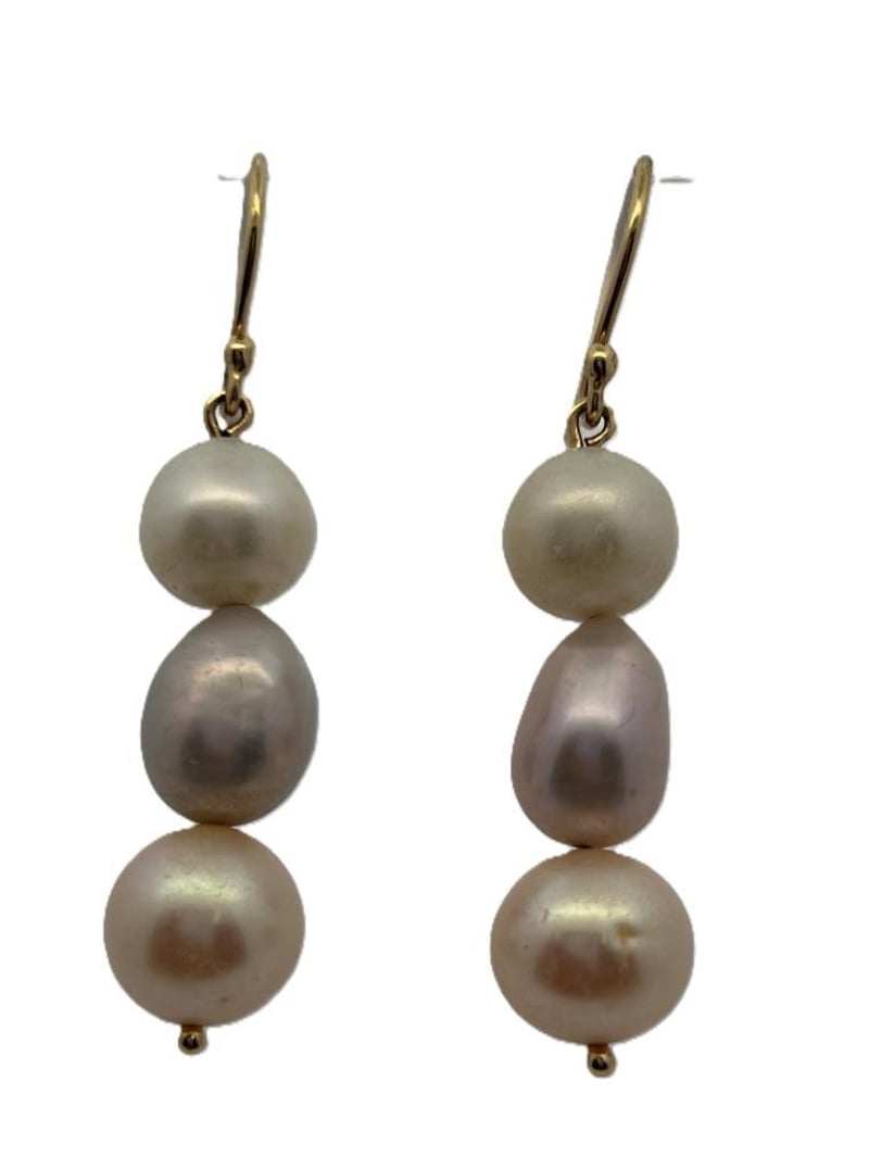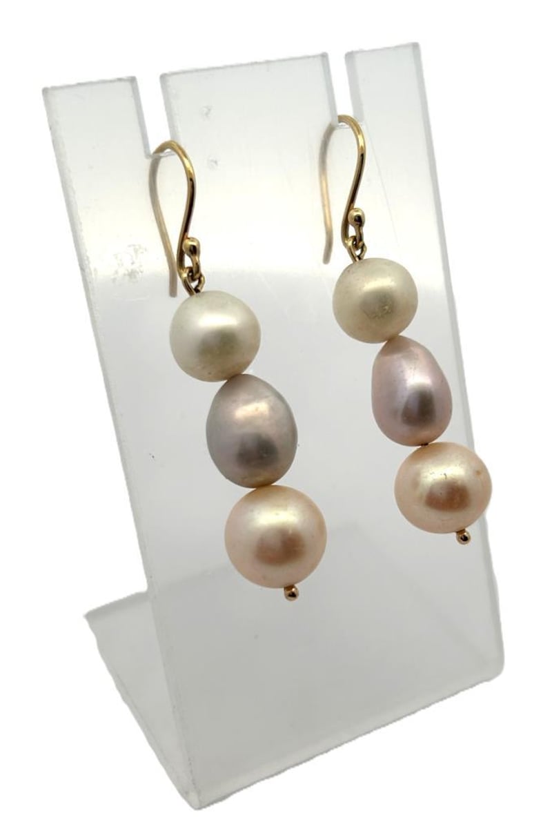 18CT YELLOW GOLD MULTICOLOURED FRESHWATER PEAL DROP EARRINGS WITH SHEPARD HOOK, EACH EARRING INCLUDES 1X ROUND CREAM 9.5-9.65MM 1 X OVAL PINK PEARL 1X ROUND CHAMPAIGN 10.5-10.55MM, DROP MEASURES 3.5CM, ACID GOLD TEST, TOTAL WEIGHT 9.9 GRAMS. THIS ITEM HAS BEEN PROFESSIONALLY VERIFIED AS A GENUINE PRODUCT AND COMES WITH ACCOMPANYING 3RD PARTY CERTIFICATE OF AUTHENTICITYCondition: Good - Refer To Images