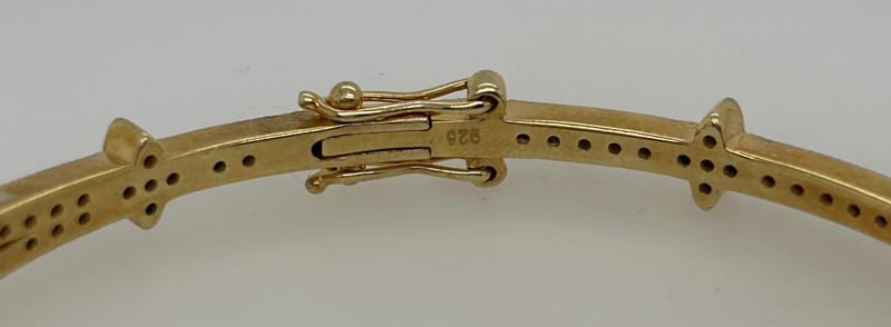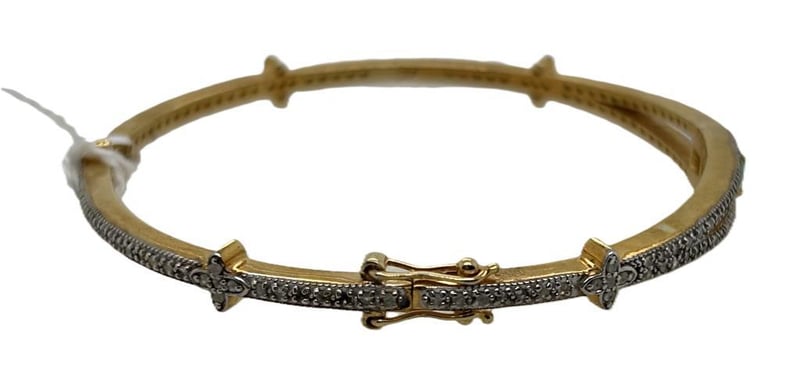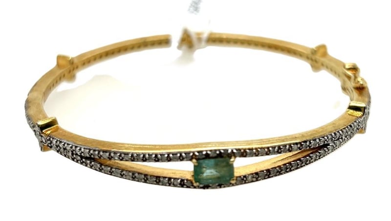 EMERALD & DIAMOND 18CT YELLOW GOLD PLATED STERLING SILVER BANGLE, EMERALD CUT 0.40CT EMERALD 4 CLAW SET IN SPLIT DESIGN, 161 ROUND CUT DIAMONDS GRAIN SET AROUND CIRCUMFERENCE OF THE BANGLE, ESTIMATED TOTAL DIAMOND WEIGHT 0.48CT, BOX CLASP WITH 2 FIGURE 8 SAFETY LATCHES, HALLMARK 925, BANGLE WEIGHT 15.5 GRAMS.Condition: Good - Refer To Images