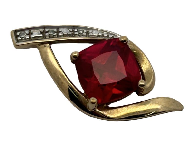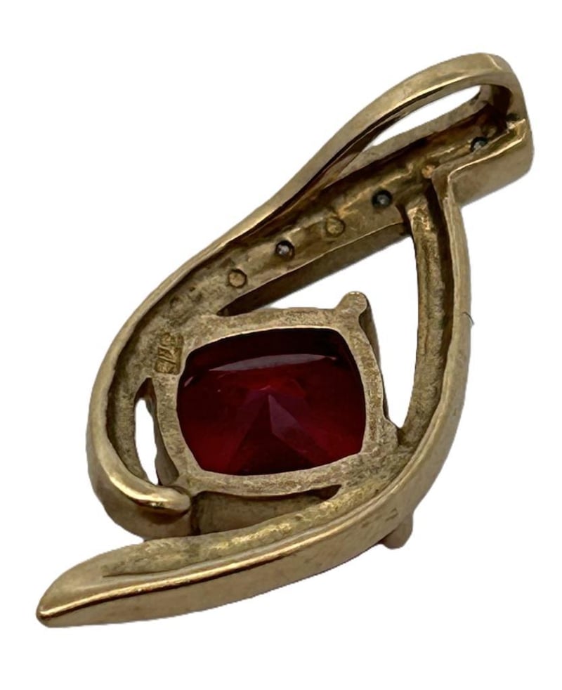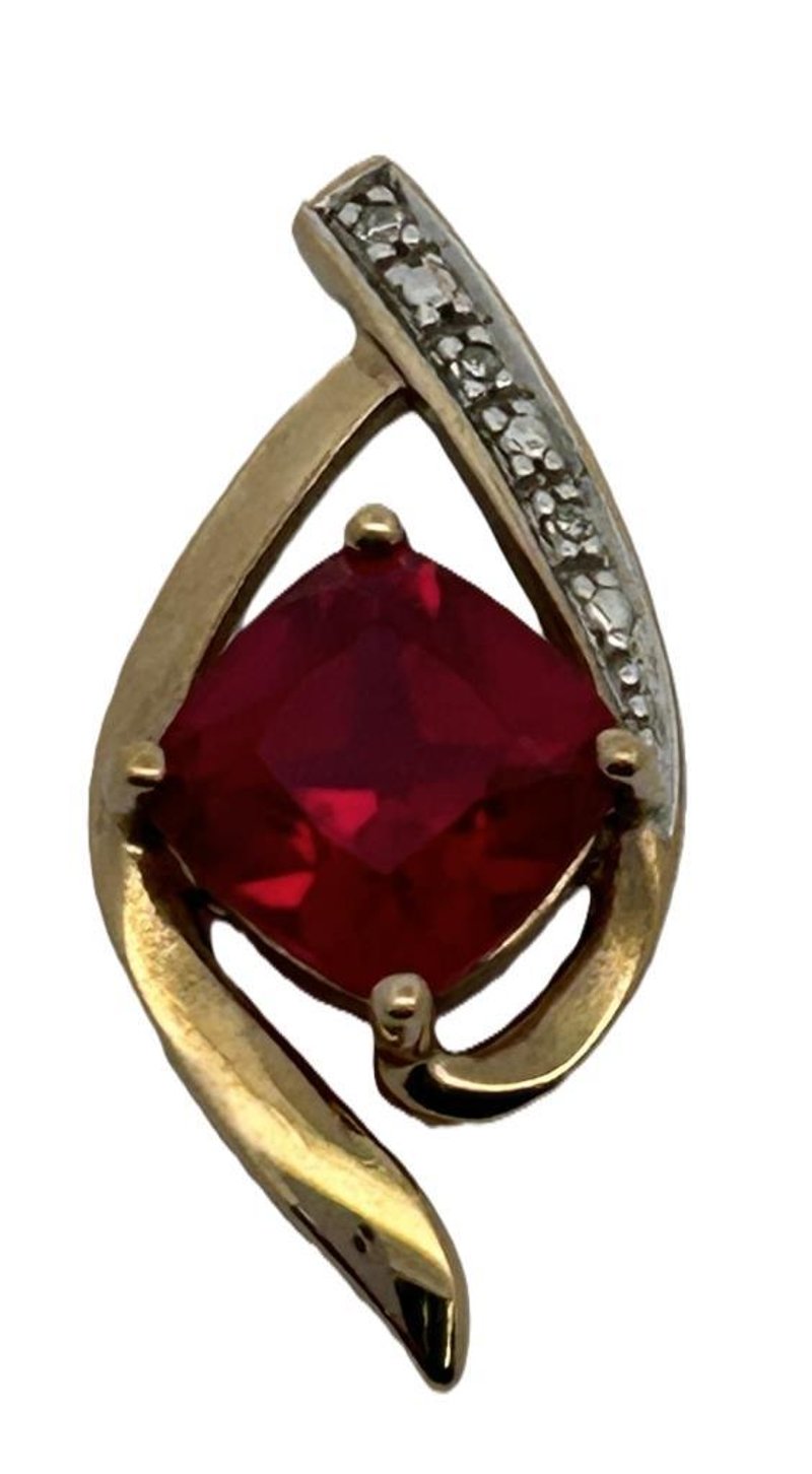 9CT YELLOW GOLD RUBY & DIAMOND SLIDER PENDANT, CUSHION CUT SYNTHETIC RUBY 4 CLAW SET WITH 2 ROUND BRILLIANT DIAMONDS GRAIN SET IN WHITE GOLD, PENDANT MEASURES 22.8X10.45MM, STAMP 375, TOTAL WEIGHT 1.88 GRAMS. THIS ITEM HAS BEEN PROFESSIONALLY VERIFIED AS A GENUINE PRODUCT AND COMES WITH ACCOMPANYING 3RD PARTY CERTIFICATE OF AUTHENTICITYCondition: Good - Refer To Images