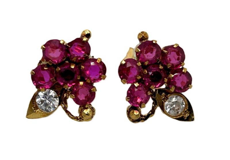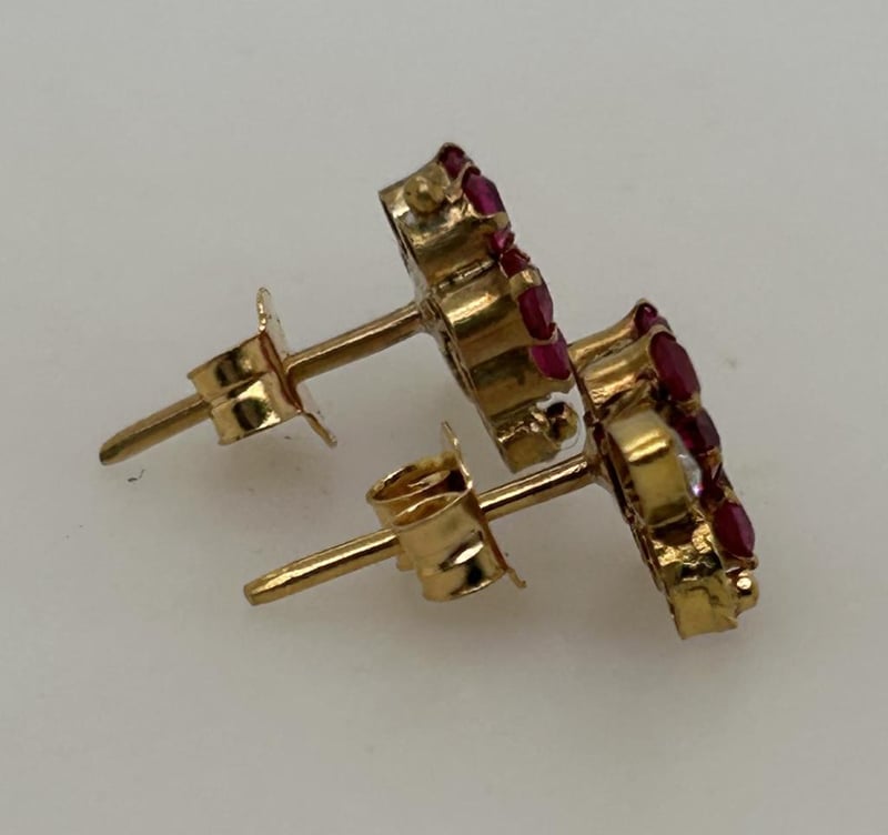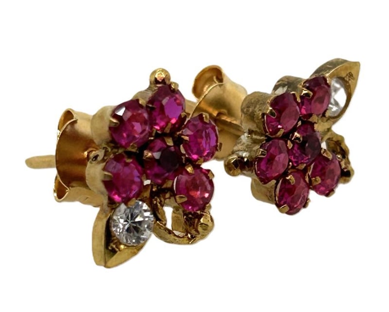 9CT YELLOW GOLD RUBY & CUBIC ZIRCONIA CLUSTER STUD EARRINGS, ONE ROUND CUBIC ZIRCONIA GRAIN SET & 6 ROUND CUT SYNTHETIC RUBIES CLAW SET, POST & BUTTERFLY FITTINGS, XRF GOLD TEST, TOTAL WEIGHT 2.87 GRAMS. THIS ITEM HAS BEEN PROFESSIONALLY VERIFIED AS A GENUINE PRODUCT AND COMES WITH ACCOMPANYING 3RD PARTY CERTIFICATE OF AUTHENTICITY.Condition: Good - Refer To Images
