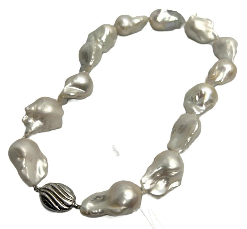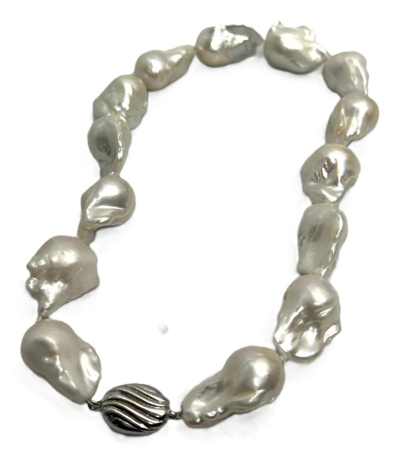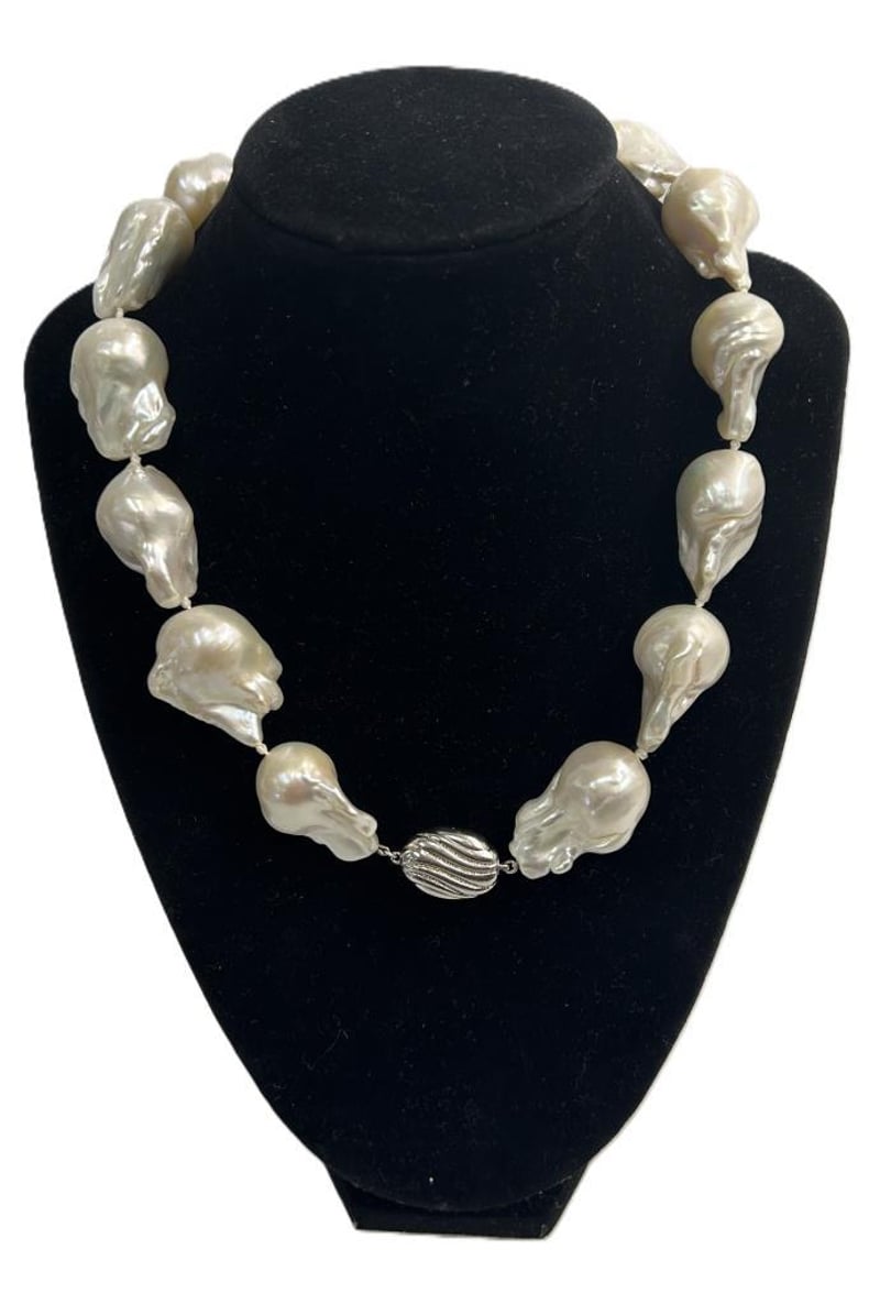 BAROQUE PEARL NECKLACE, FEATURING LARGE ORGANICALLY SHAPED WHITE BAROQUE CULTURED PEARLS MEASURING APPROXIMATELY 22.6 × 20.5 MM TO 31.1 × 21.0 MM, INDIVIDUALLY HAND-KNOTTED ON SILK THREAD AND FINISHED WITH A STERLING SILVER RIBBED CLASP. THE NECKLACE MEASURES APPROXIMATELY 45 CM IN LENGTH, DISPLAYING EXCELLENT LUSTRE AND NATURAL SURFACE TEXTURE CHARACTERISTIC OF BAROQUE PEARLS.