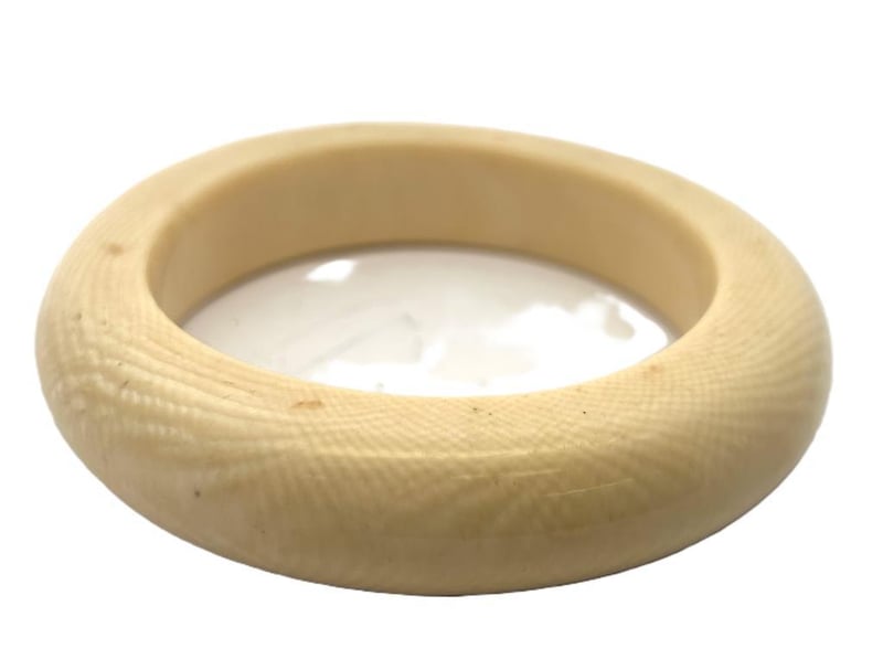 VINTAGE IVORY BANGLE, CREAM-TONED BANGLE WITH SUBTLE NATURAL GRAIN TEXTURE, SMOOTH ROUNDED FORM WITH GENTLE SHEEN, MEASURES 7CM DIAMETER, 2CM WIDTH.Condition: Good - Refer To Images