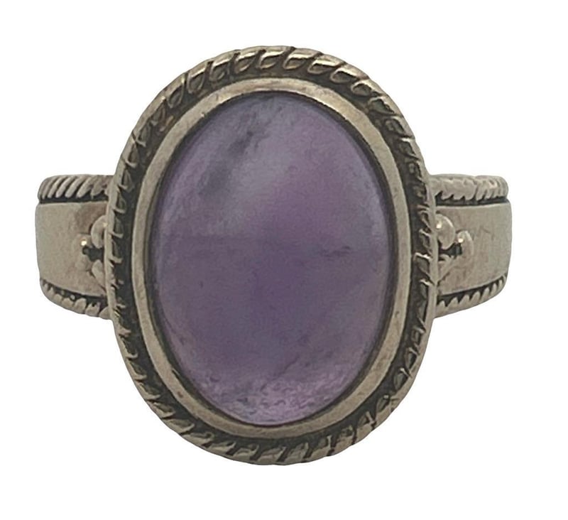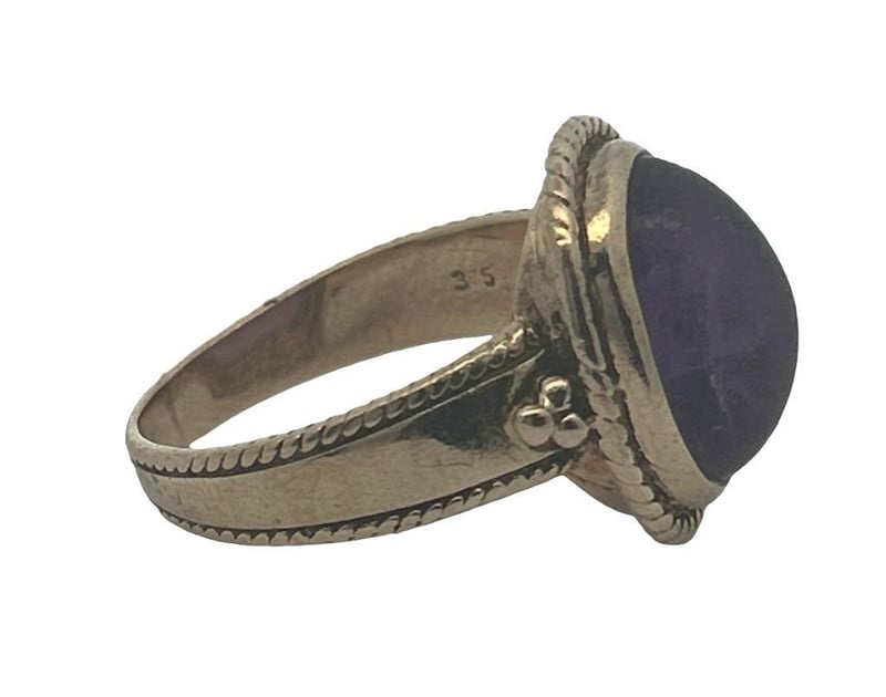 9CT YELLOW GOLD AMETHYST RING, OVAL CABOCHON AMETHYST 13X9.3MM BEZEL SET WITH OUTER ROPE DESIGN & PATTERN SHOULDERS WITH TAPERED 3.2-6.2MM BAND, STAMP 375, RING WEIGHT 6.10 GRAMS. THIS ITEM HAS BEEN PROFESSIONALLY VERIFIED AS A GENUINE PRODUCT AND COMES WITH ACCOMPANYING 3RD PARTY CERTIFICATE OF AUTHENTICITY