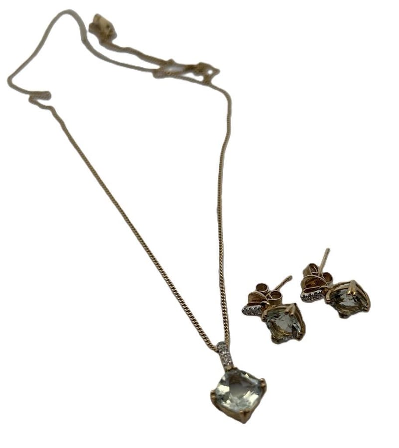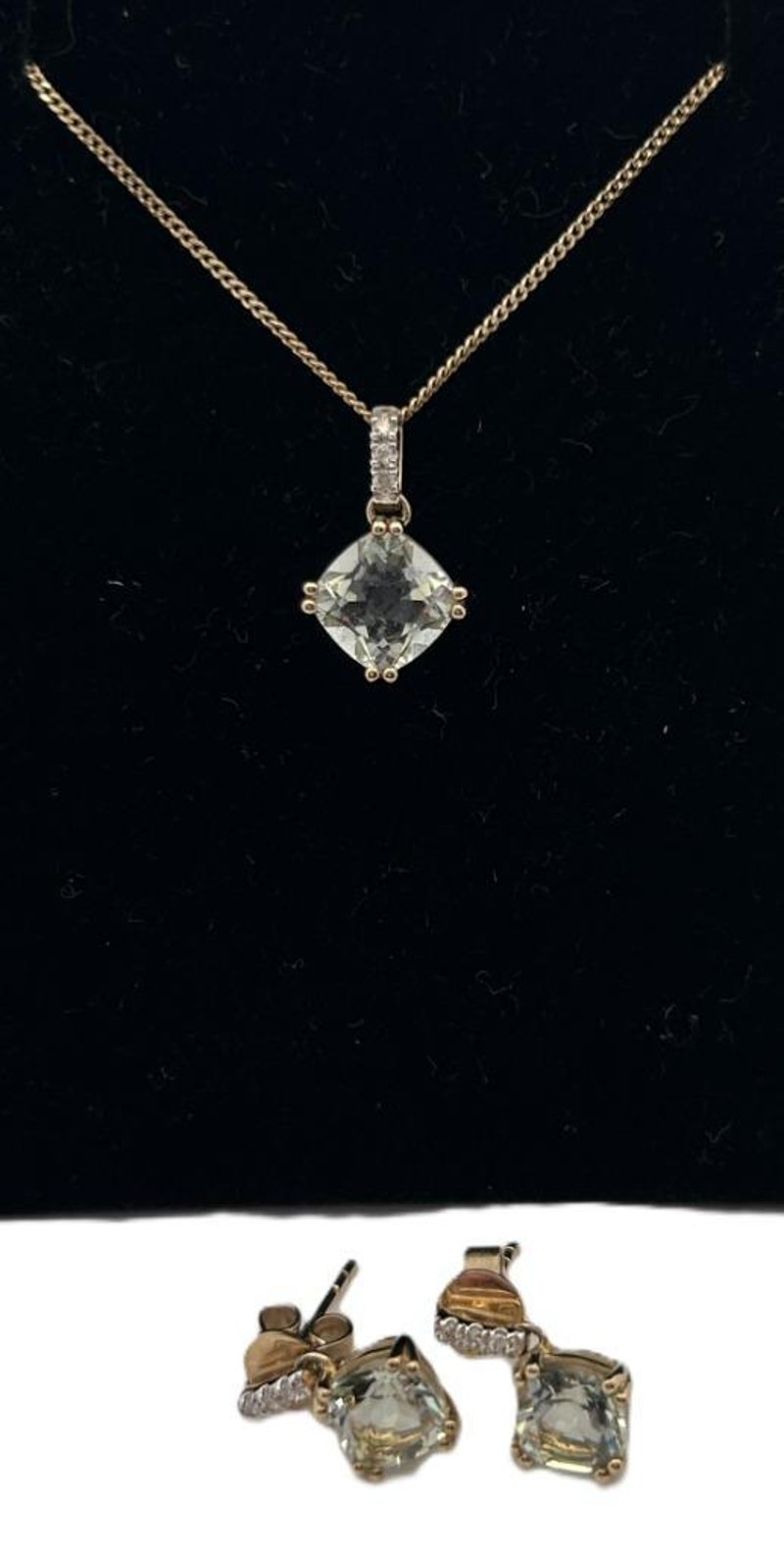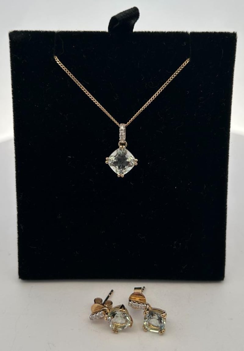 9CT YELLOW GOLD PRASIOLITE & 0.10CT DIAMOND EARRING & PENDANT SET WITH A STERLING SILVER CHAIN, PENDANT INCLUDES CUSHION CUT PRASIOLITE 8 CLAW SET WITH 3 ROUND BRILLIANT CUT DIAMONDS GRAIN SET IN BALE ON GOLD LAYERED STERLING SILVER CURB LINK CHAIN WITH A BOLT CLASP, EARRINGS INCLUDE CUSHION CUT PRASIOLITE 8 CLAW SET WITH 3 ROUND BRILLIANT CUT DIAMONDS GRAIN SET IN DROP WITH STEM & BUTTERFLY FITTING, ESTIMATE TOTAL DIAMOND WEIGHT 0.10CT, STAMP 375/925 ITALY, TOTAL WEIGHT 3.75 GRAMS. THIS ITEM HAS BEEN PROFESSIONALLY VERIFIED AS A GENUINE PRODUCT AND COMES WITH ACCOMPANYING 3RD PARTY CERTIFICATE OF AUTHENTICITYCondition: Good - Refer To Images997339+32
