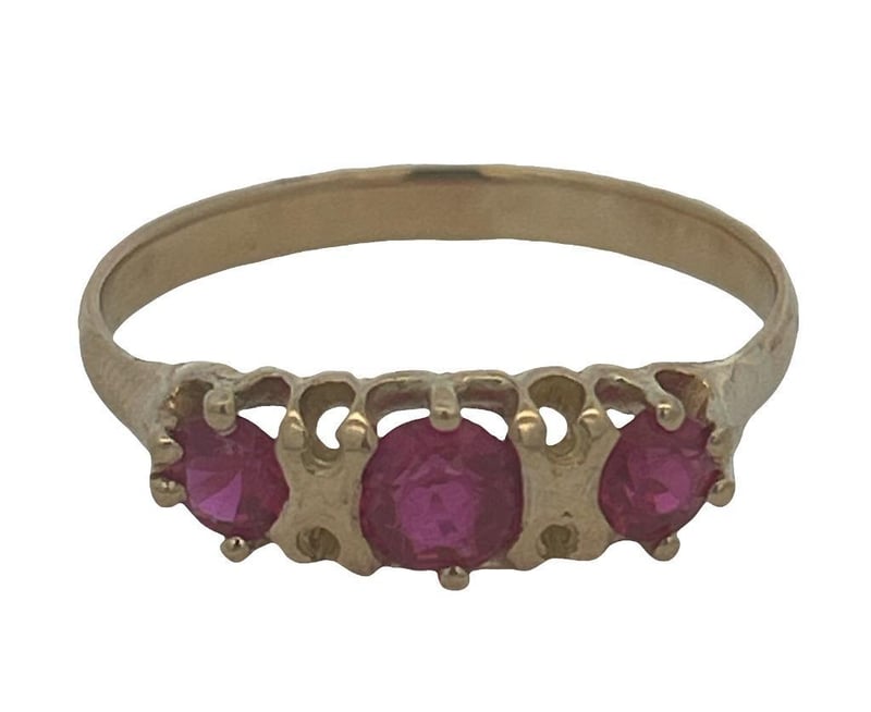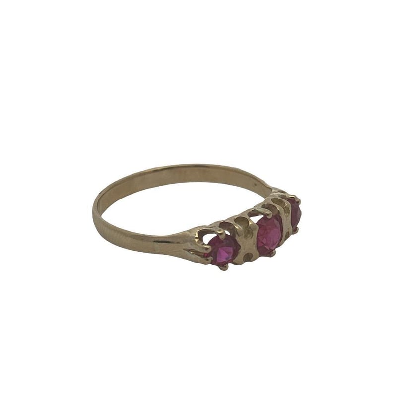 9CT YELLOW GOLD SYNTHETIC RUBY RING, 3 ROUND CUT RUBIES PART CHANNEL & CLAW SET IN ROW, RING WEIGHT 4.18 GRAMS, XRF GOLD TEST. THIS ITEM HAS BEEN PROFESSIONALLY VERIFIED AS A GENUINE PRODUCT AND COMES WITH ACCOMPANYING 3RD PARTY CERTIFICATE OF AUTHENTICITY
