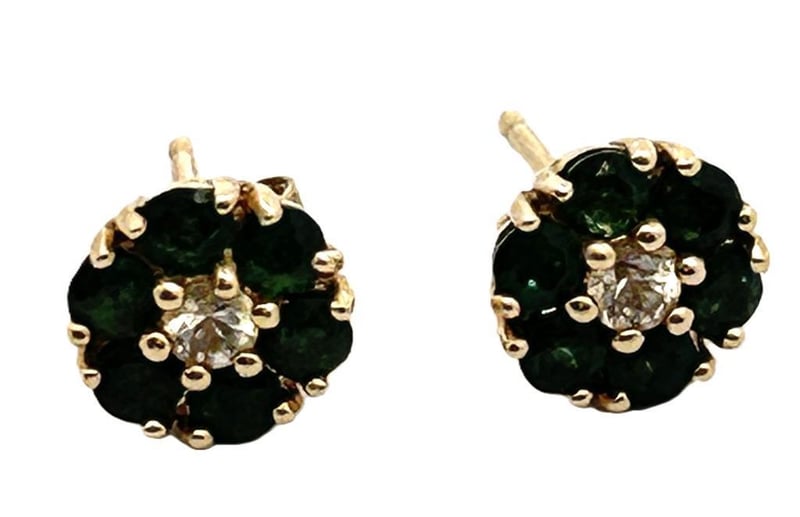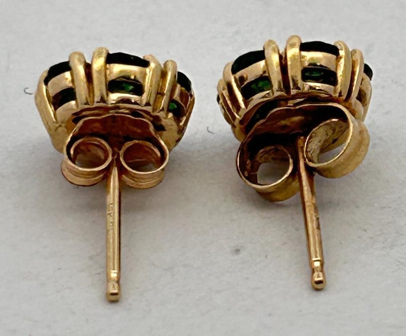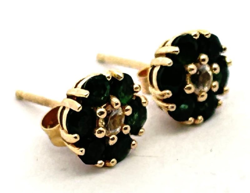 14CT YELLOW GOLD GREEN TOURMALINE & 0.10CT DIAMOND CLUSTER STUD EARRINGS, EACH STUD INCLUDES CENTRE ROUND BRILLIANT CUT DIAMOND BEAD SET SURROUNDED BY 6 ROUND CUT TOURMALINES WITH STEM & BUTTERFLY FITTING, ESTIMATE TOTAL DIAMOND WEIGHT 0.10CT, STAMP 14K, TOTAL WEIGHT 1.5 GRAMS. THIS ITEM HAS BEEN PROFESSIONALLY VERIFIED AS A GENUINE PRODUCT AND COMES WITH ACCOMPANYING 3RD PARTY CERTIFICATE OF AUTHENTICITY