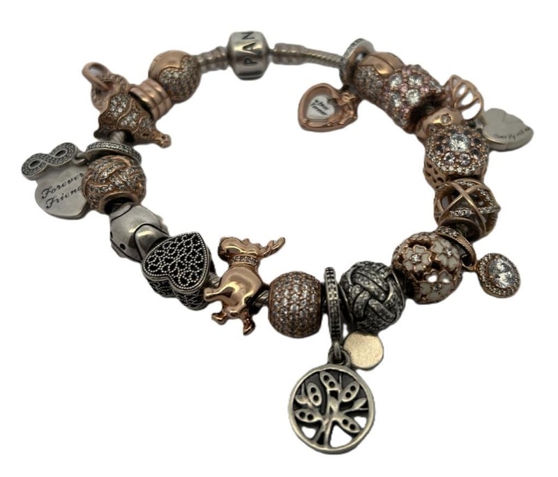 PANDORA MOMENTS BRACELET, FEATURING MIXED TWO-TONE CHARMS IN STERLING SILVER AND 14K ROSE GOLD PLATING, HALLMARKED ALE 925, ALE R, AND ALE MET. THE BRACELET INCLUDES AN ASSORTMENT OF DETAILED CHARMS SUCH AS PAVÉ-SET HEARTS, FILIGREE SPHERES, ENAMEL AND CRYSTAL-SET DESIGNS, ANIMAL MOTIFS, AND SENTIMENTAL DANGLES INCLUDING “FOREVER FRIENDS” AND “TREE OF LIFE.” ALL COMPONENTS ARE ORIGINAL PANDORA PIECES, DISPLAYING LIGHT WEAR CONSISTENT WITH USE. A TOTAL COMBINED WEIGHT 62.6 GRAMS.