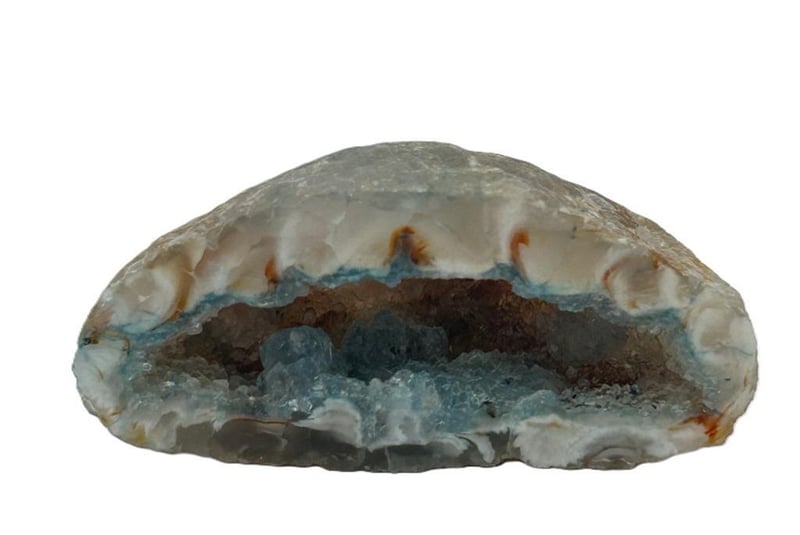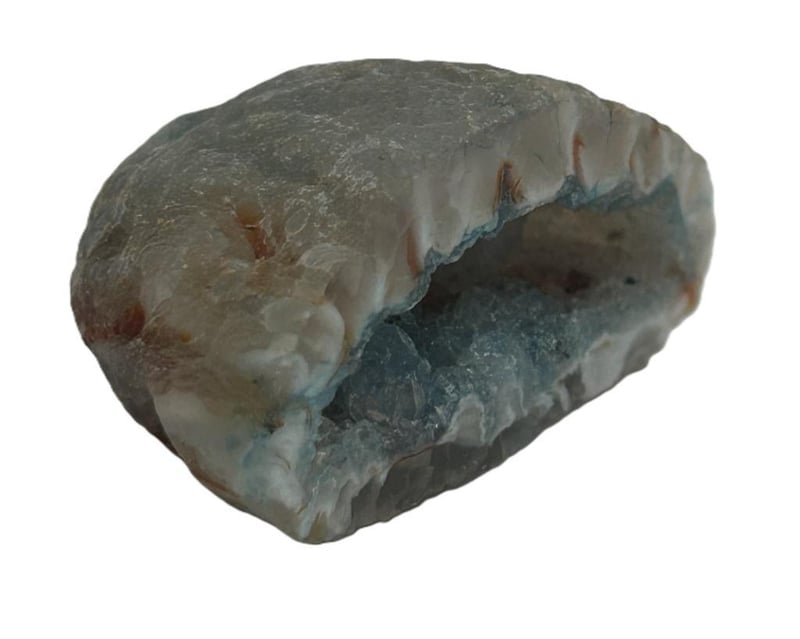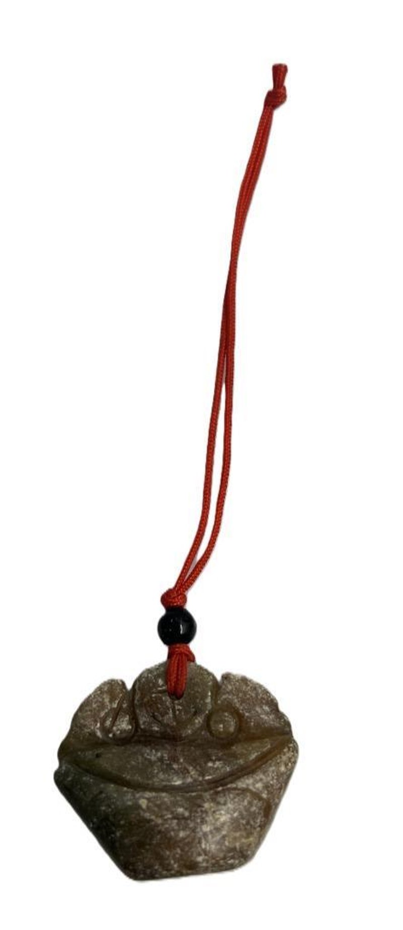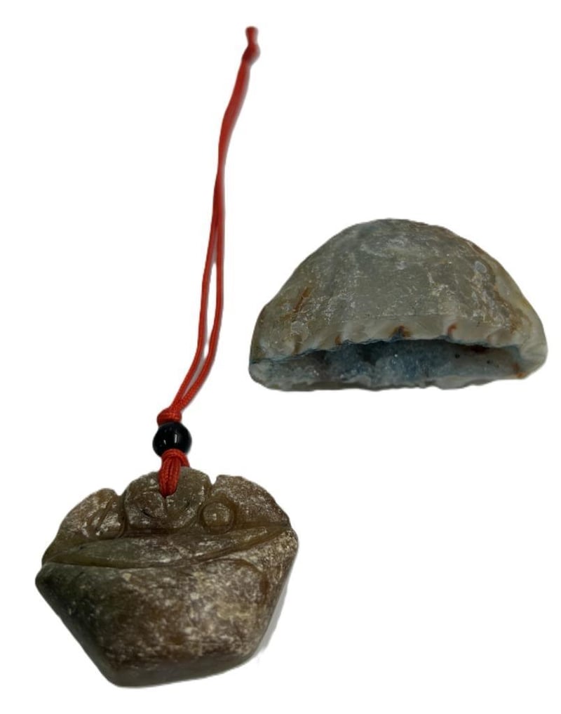 TWO-PIECE JADE LOT, COMPRISING A CARVED JADE PENDANT DEPICTING A STYLISED FROG SUSPENDED FROM A RED CORD WITH A BLACK BEAD ACCENT, TOGETHER WITH A NATURAL HALF GEODE-STYLE JADE SPECIMEN SHOWING PALE GREEN AND BLUE-GREY CRYSTALLINE FORMATIONS WITHIN. BOTH PIECES DISPLAY NATURAL INCLUSIONS, SURFACE TEXTURE, AND COLOUR VARIATION TYPICAL OF UNTREATED JADE.Condition: Good - Refer To Images997339+54