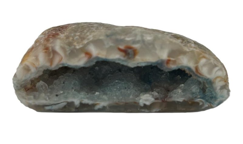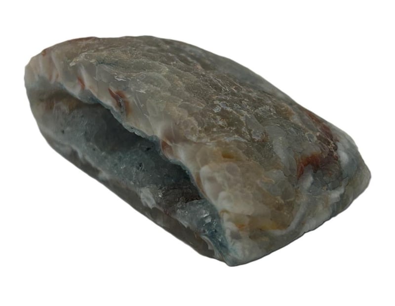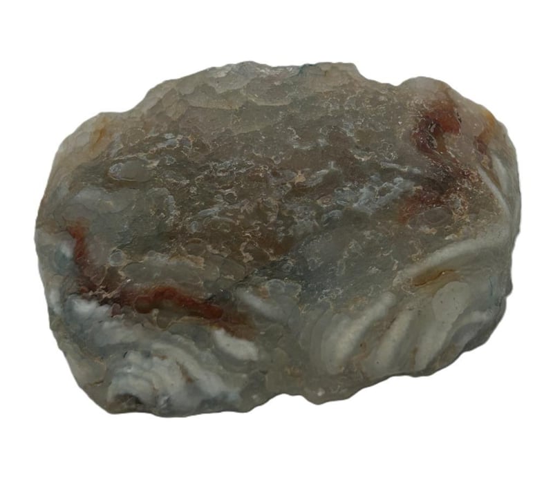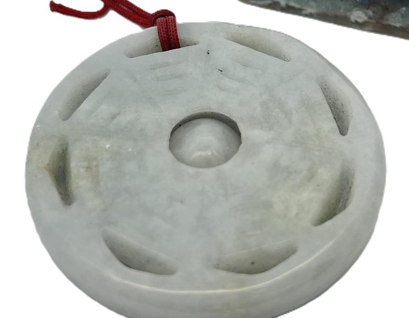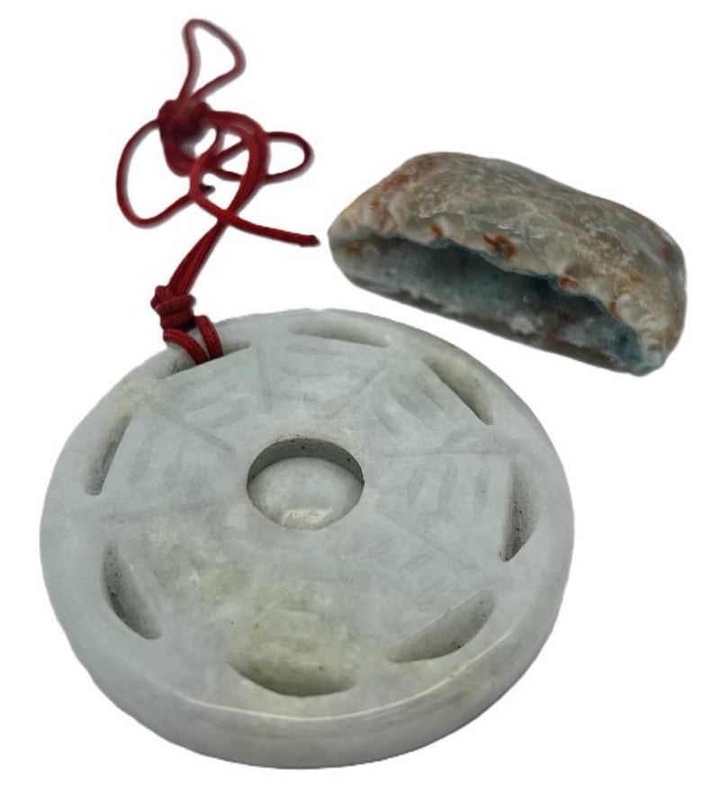 TWO-PIECE JADE LOT, COMPRISING A CIRCULAR CARVED JADE DISC PENDANT FEATURING TRADITIONAL OPENWORK GEOMETRIC MOTIFS AND A CENTRAL APERTURE, SUSPENDED ON A RED CORD, TOGETHER WITH A NATURAL JADE GEODE SPECIMEN DISPLAYING BLUE-GREY CRYSTALLINE FORMATIONS AND EARTHY BROWN VEINING. BOTH PIECES EXHIBIT NATURAL INCLUSIONS AND SURFACE VARIATIONS CHARACTERISTIC OF GENUINE JADE.Condition: Good - Refer To Images997339+75