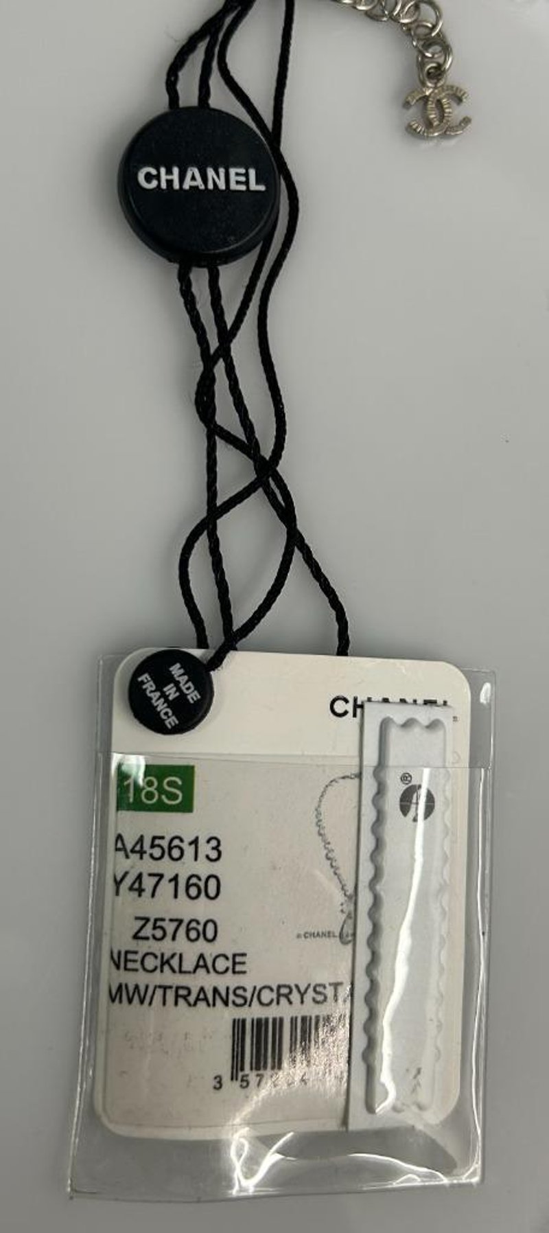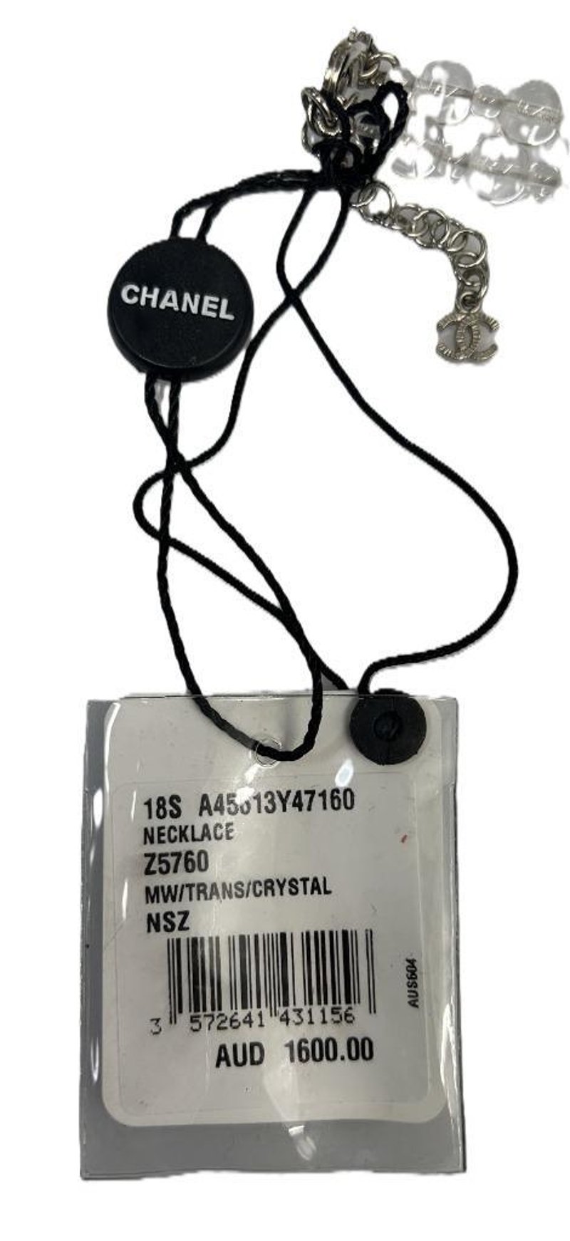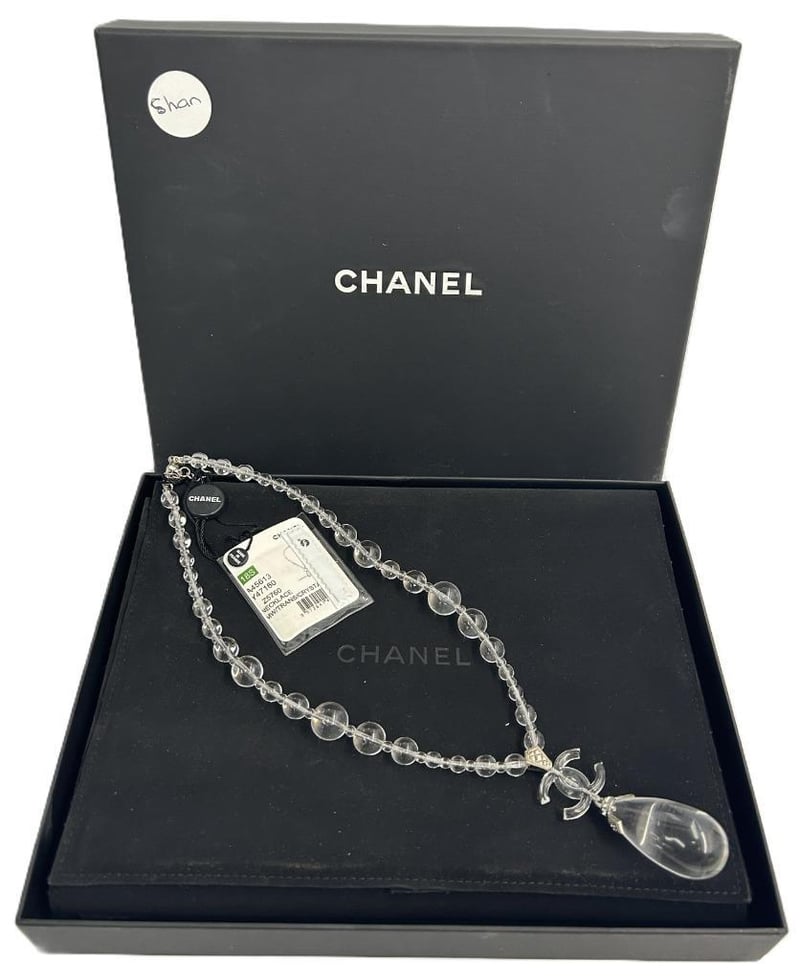 CHANEL 18S TRANSPARENT CRYSTAL DROP NECKLACE, FEATURING CLEAR CRYSTAL BEADS, SIGNATURE CC LOGO, AND A LARGE TEARDROP PENDANT WITH SILVER-TONE DETAILING. NECKLACE LENGTH 50CM NOT INCLUDING PENDANT, MADE IN FRANCE, COMPLETE WITH ORIGINAL TAG AND CHANEL PRESENTATION BOX. ORIGINALLY RETAILED FOR AUD $1600.00