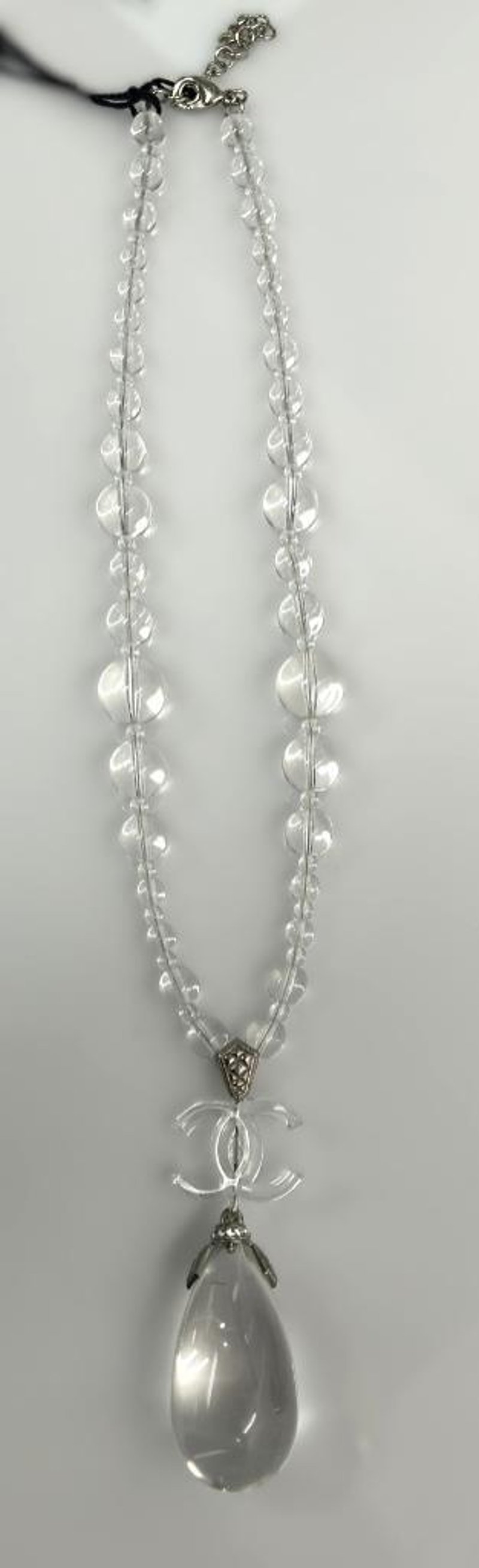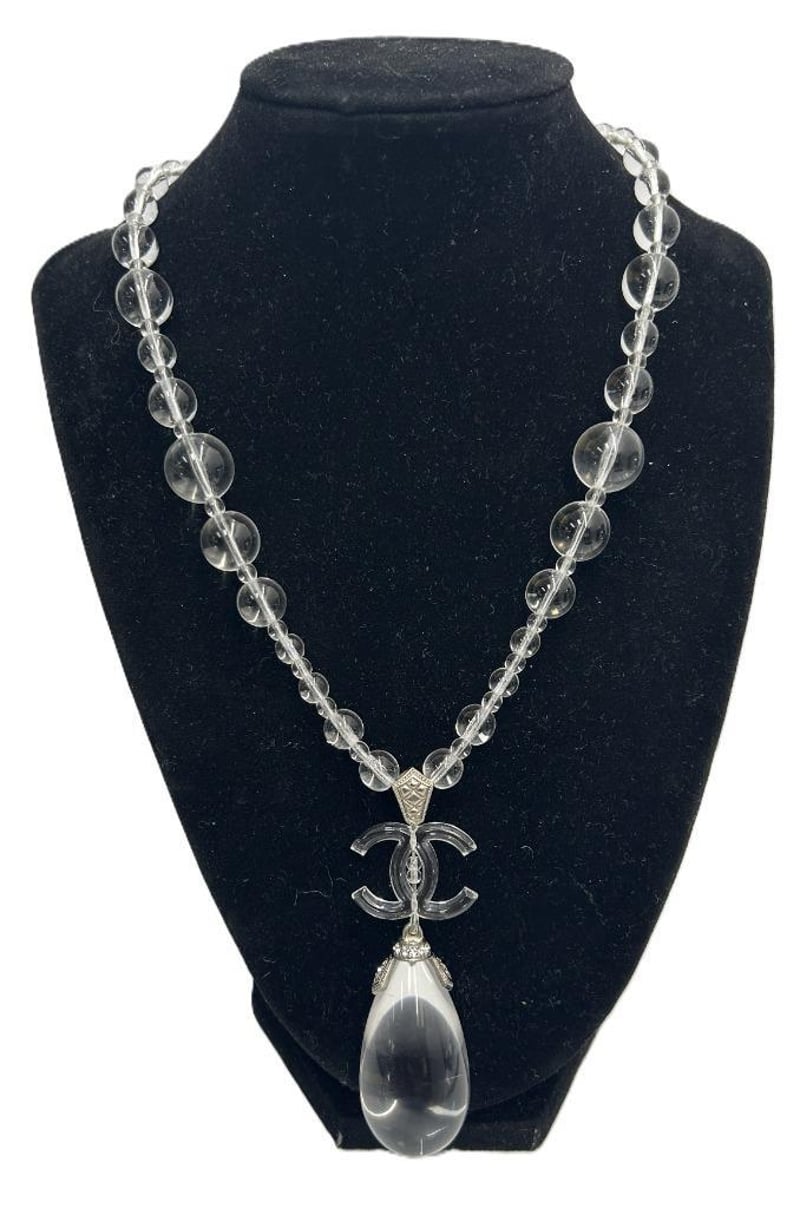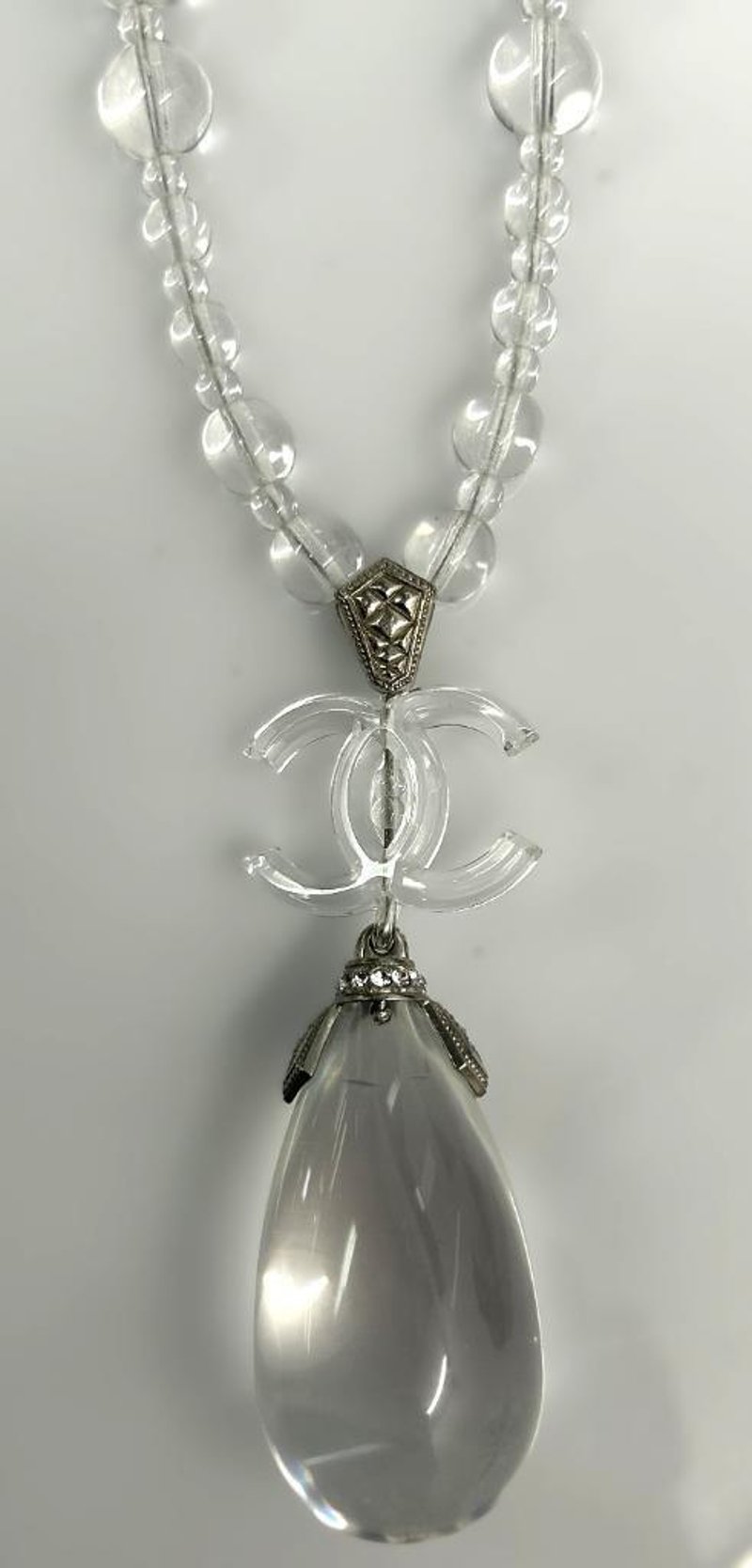 CHANEL 18S TRANSPARENT CRYSTAL DROP NECKLACE, FEATURING CLEAR CRYSTAL BEADS, SIGNATURE CC LOGO, AND A LARGE TEARDROP PENDANT WITH SILVER-TONE DETAILING. NECKLACE LENGTH 50CM NOT INCLUDING PENDANT, MADE IN FRANCE, COMPLETE WITH ORIGINAL TAG AND CHANEL PRESENTATION BOX. ORIGINALLY RETAILED FOR AUD $1600.00