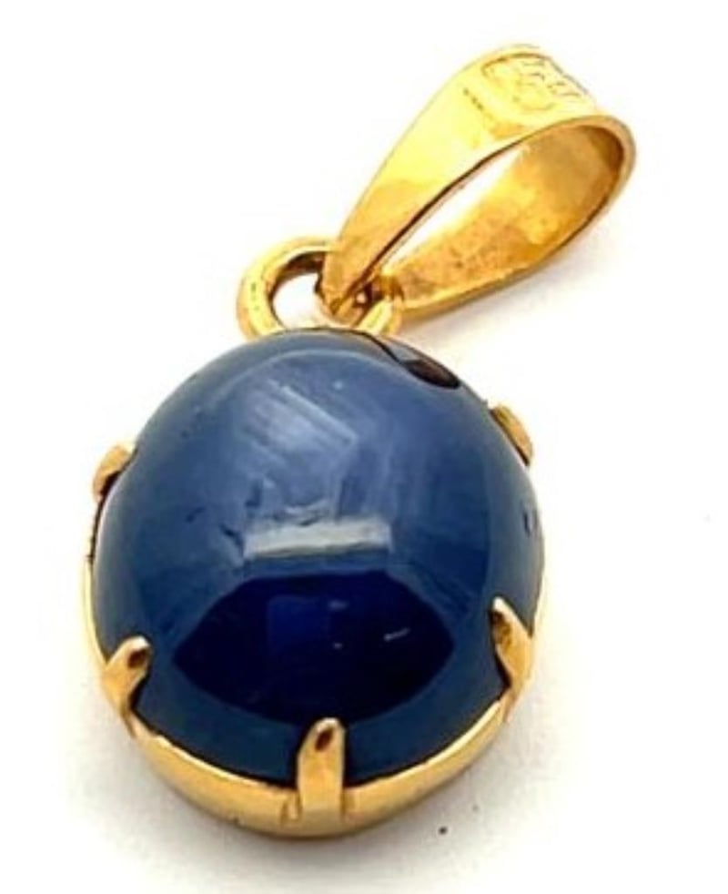 22CT YELLOW GOLD BLUE STAR SAPPHIRE PENDANT, OVAL CABOCHON CUT SAPPHIRE 6 CLAW SET, PENDANT MEASURES 1.9X1.0CM INCLUDING BALE, XRF GOLD TEST, PENDANT WEIGHT 2.36 GRAMS. THIS ITEM HAS BEEN PROFESSIONALLY VERIFIED AS A GENUINE PRODUCT AND COMES WITH ACCOMPANYING 3RD PARTY CERTIFICATE OF AUTHENTICITY