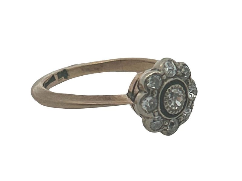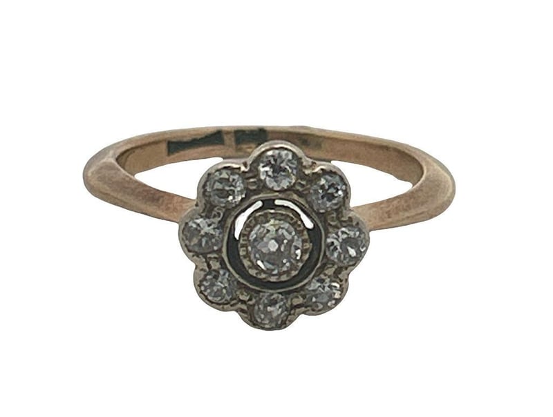 9CT YELLOW GOLD VINTAGE 0.26CT DIAMOND CLUSTER RING, CENTRE 0.10CT ROUND EUROPEAN CUT DIAMOND MILLI GRAIN SET SURROUND BY 8 ROUND CUT DIAMONDS PART BEZEL SET WITH SCALLOP EDGE, ESTIMATE TOTAL DIAMOND WEIGHT 0.26CT, XRF GOLD TEST, RING WEIGHT 2.82 GRAMS. THIS ITEM HAS BEEN PROFESSIONALLY VERIFIED AS A GENUINE PRODUCT AND COMES WITH ACCOMPANYING 3RD PARTY CERTIFICATE OF AUTHENTICITY
