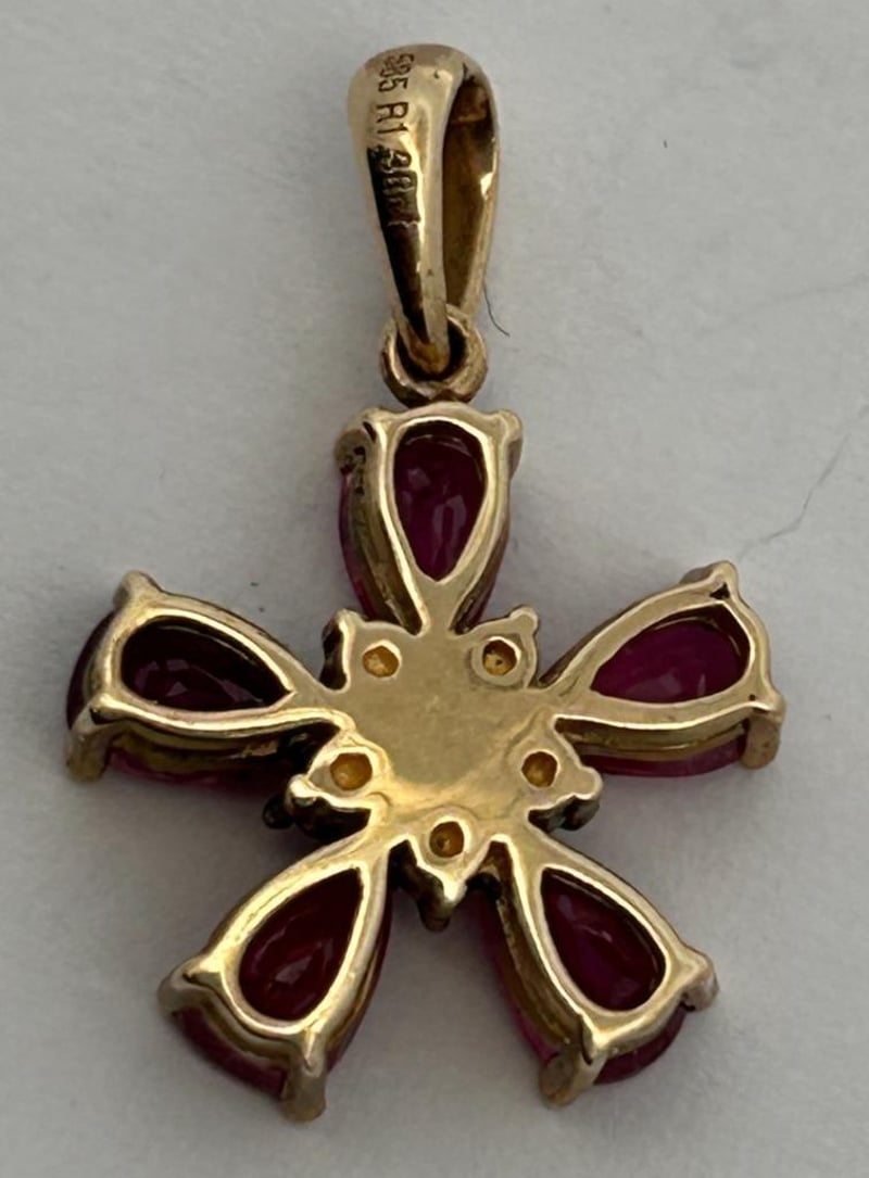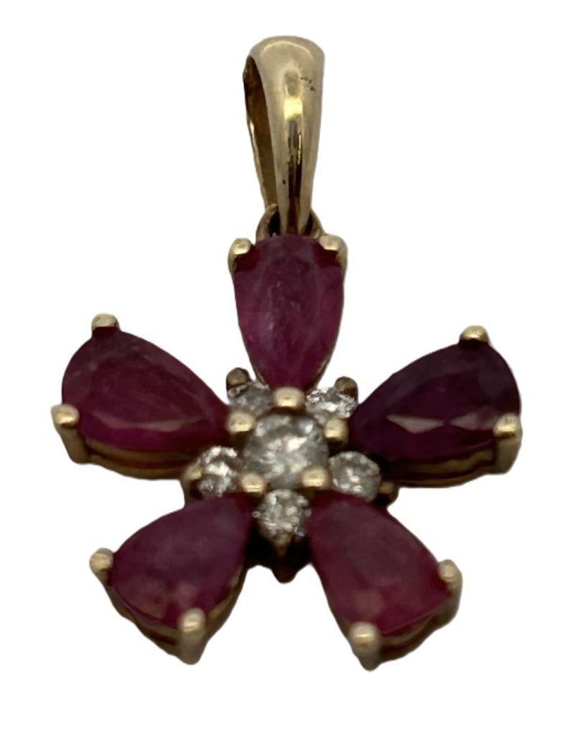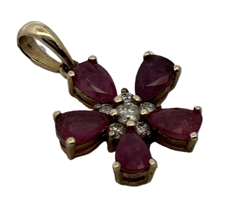14CT YELLOW GOLD 1.38CT RUBY & DIAMOND PENDANT, 6 ROUND BRILLIANT CUT DIAMONDS SHARED CLAW SET SURROUNDED BY 5 PEAR CUT RUBIES 3 CLAW SET, STAMP 585, TOTAL RUBY WEIGHT 1.38CT, PENDANT WEIGHT 1.40GRAMS. THIS ITEM HAS BEEN PROFESSIONALLY VERIFIED AS A GENUINE PRODUCT AND COMES WITH ACCOMPANYING 3RD PARTY CERTIFICATE OF AUTHENTICITYCondition: Good - Refer To Images997339+143