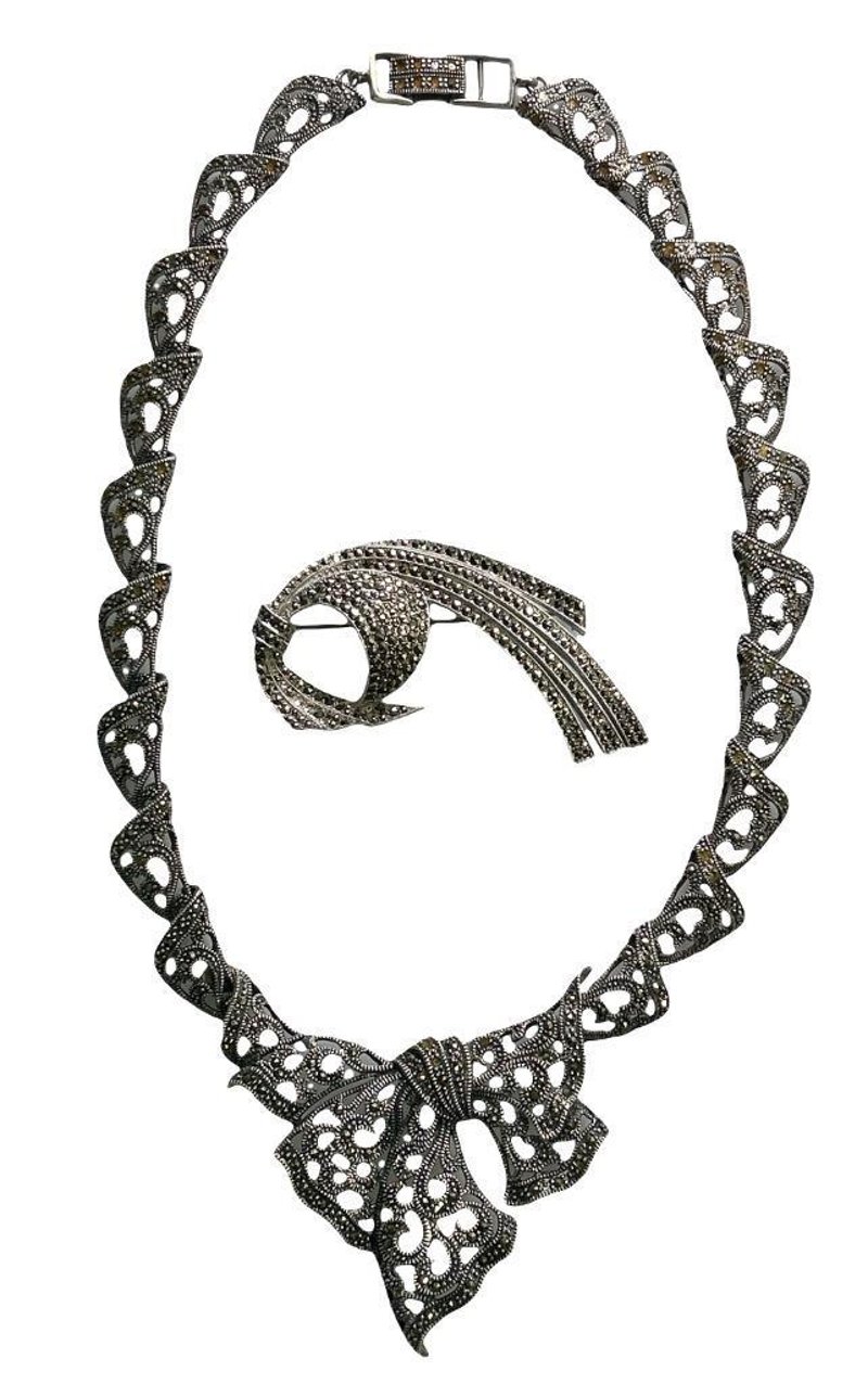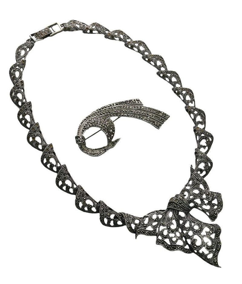 ART DECO STERLING SILVER MARCASITE BOW NECKLACE & BROOCH, RIBBON-LIKE CHOKER WITH INTRICATE BOW PENDANT & FOLD OVER CLASP, HALLMARK 925, SWIRLING FEATHER DESIGN BROOCH SET WITH MARCASITE, HALLMARK STG SIL, COMBINED WEIGHT 77.7 GRAMS.Condition: Good - Refer To Images997339+55