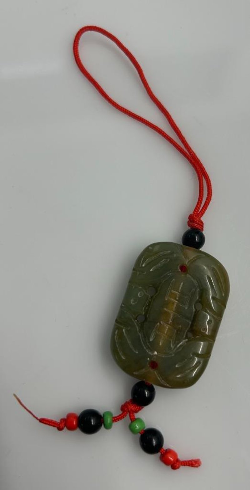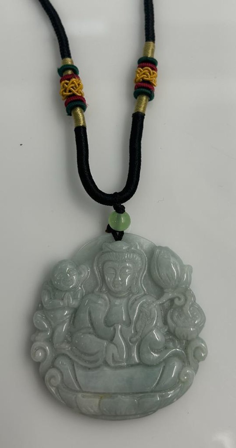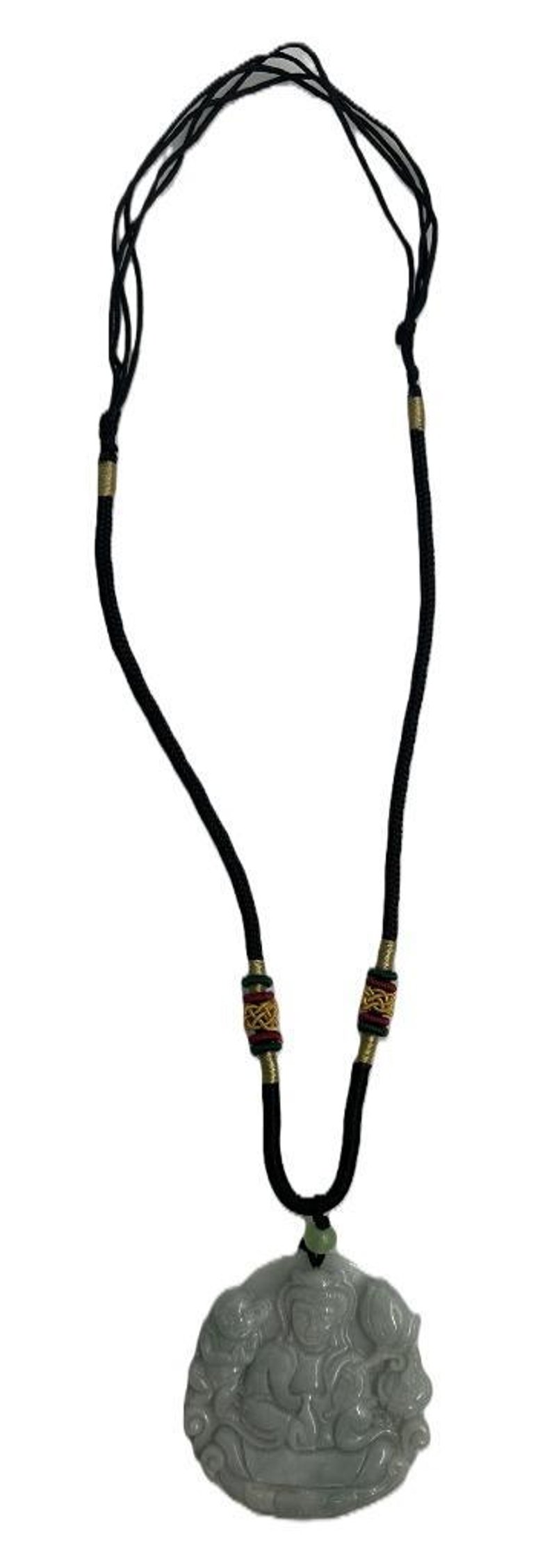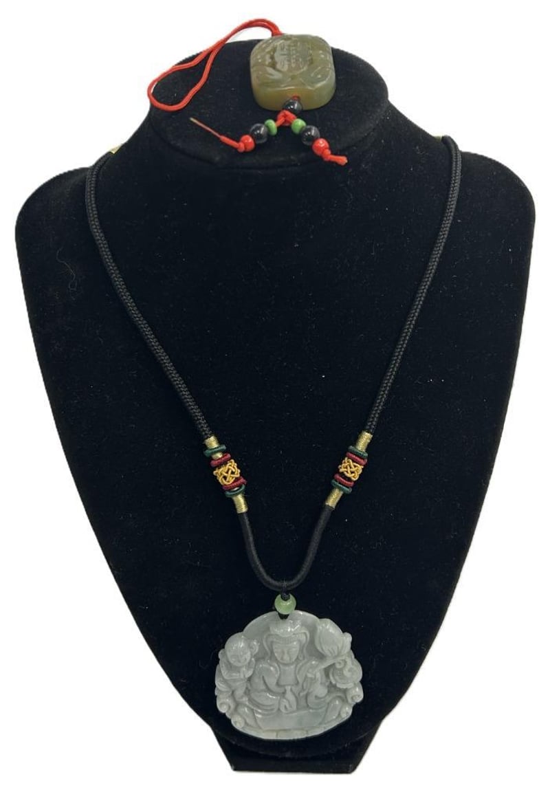 TWO-PIECE JADE LOT, COMPRISING A PALE GREEN JADE PENDANT FINELY CARVED WITH A SEATED BUDDHA FIGURE AND SYMBOLIC MOTIFS, SUSPENDED ON AN ADJUSTABLE BLACK CORD WITH DECORATIVE WOVEN ACCENTS, TOGETHER WITH AN OLIVE-GREEN RECTANGULAR JADE AMULET INTRICATELY CARVED WITH TRADITIONAL SYMBOLS AND STRUNG ON A RED CORD WITH BLACK AND GREEN BEAD DETAILING. BOTH PIECES DISPLAY NATURAL INCLUSIONS AND POLISH VARIATIONS TYPICAL OF GENUINE JADE CRAFTSMANSHIP, REPRESENTING HARMONY, PROTECTION, AND GOOD FORTUNE.Condition: Good - Refer To Images997339+25
