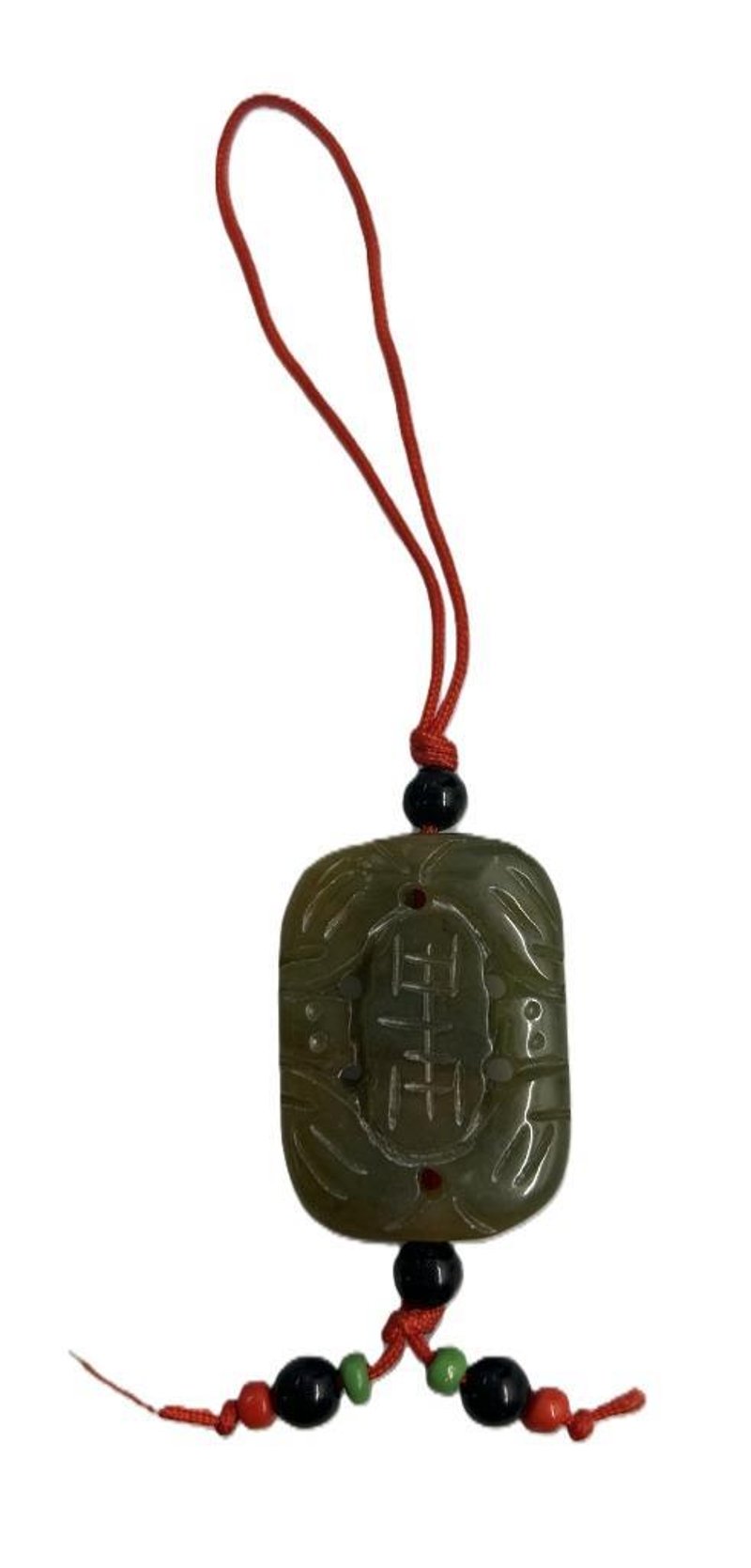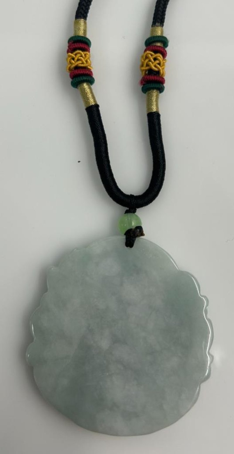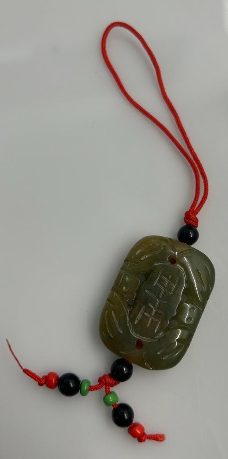 TWO-PIECE JADE LOT, COMPRISING A PALE GREEN JADE PENDANT FINELY CARVED WITH A SEATED BUDDHA FIGURE AND SYMBOLIC MOTIFS, SUSPENDED ON AN ADJUSTABLE BLACK CORD WITH DECORATIVE WOVEN ACCENTS, TOGETHER WITH AN OLIVE-GREEN RECTANGULAR JADE AMULET INTRICATELY CARVED WITH TRADITIONAL SYMBOLS AND STRUNG ON A RED CORD WITH BLACK AND GREEN BEAD DETAILING. BOTH PIECES DISPLAY NATURAL INCLUSIONS AND POLISH VARIATIONS TYPICAL OF GENUINE JADE CRAFTSMANSHIP, REPRESENTING HARMONY, PROTECTION, AND GOOD FORTUNE.Condition: Good - Refer To Images997339+25