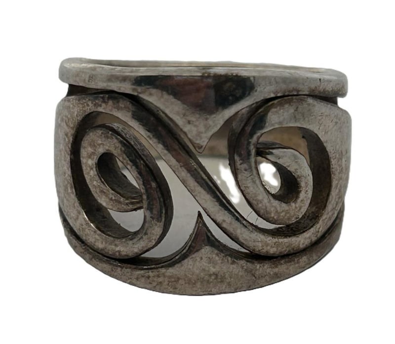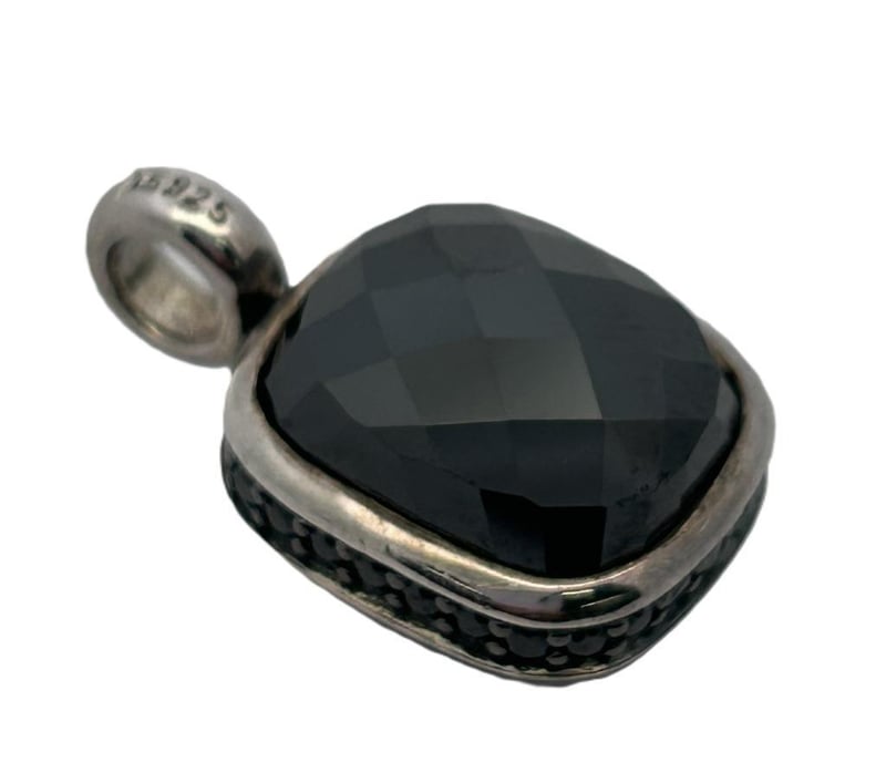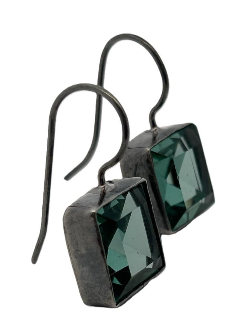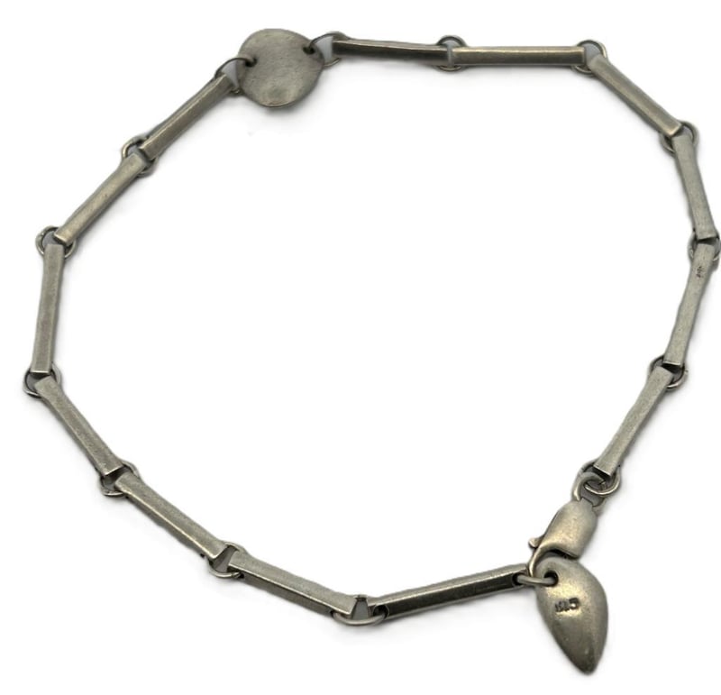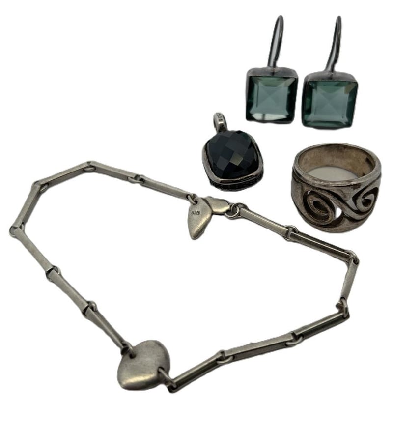 STERLING SILVER JEWELLERY LOT, COMPRISING A HEART-LINK BRACELET WITH TUBULAR CONNECTORS, A PAIR OF GREEN SQUARE-CUT DROP EARRINGS, A FACETED BLACK GEMSTONE PENDANT, AND A WIDE SWIRL-PATTERNED BAND RING. ALL PIECES ARE CRAFTED IN STERLING SILVER, TESTED AND MARKED 925 STERLING, WITH LIGHT WEAR CONSISTENT WITH AGE. A TOTAL COMBINED WEIGHT 34.5 GRAMS.Condition: Good - Refer To Images997339+47