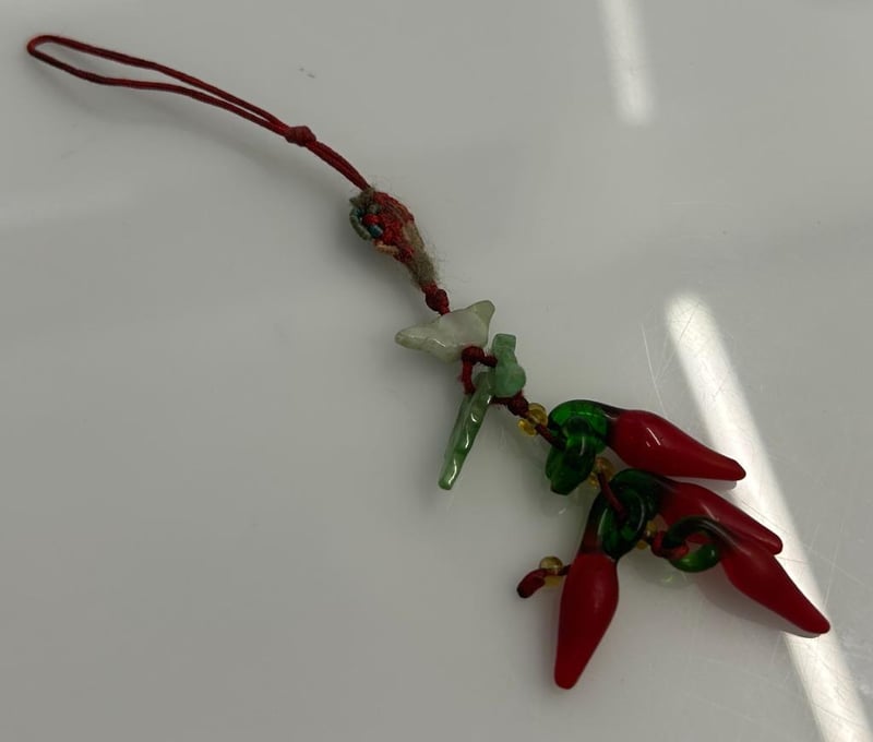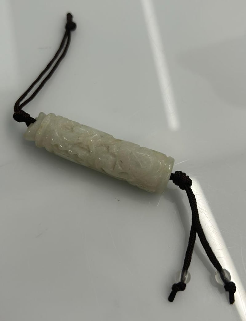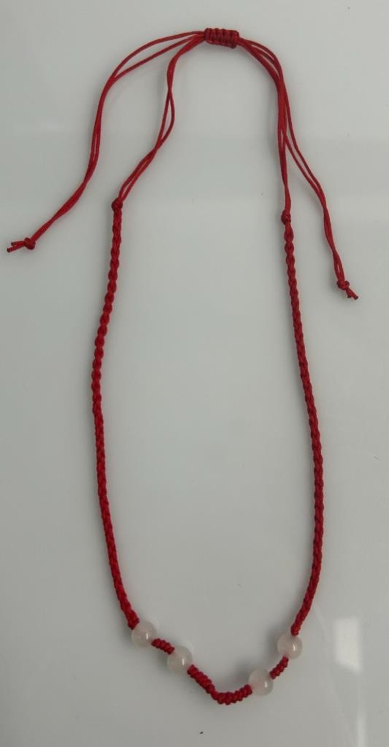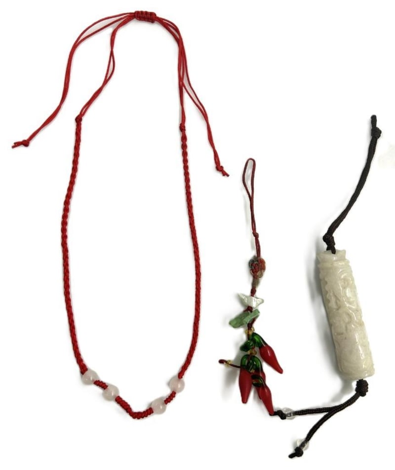 THREE-PIECE JADE & QUARTZ LOT, COMPRISING A RED WOVEN CORD NECKLACE ACCENTED WITH FIVE TRANSLUCENT ROSE QUARTZ BEADS, A VIBRANT GLASS AND JADE CHARM FEATURING RED AND GREEN CHILI PEPPER PENDANTS SYMBOLISING PROSPERITY AND PROTECTION, AND A CARVED CYLINDRICAL WHITE JADE MASSAGE ROLLER SUSPENDED ON A DARK CORD. EACH PIECE SHOWCASES TRADITIONAL CRAFTSMANSHIP AND CULTURAL SYMBOLISM, BLENDING NATURAL STONE, GLASS, AND CORDED ELEMENTS IN A COLLECTION REFLECTING GOOD FORTUNE AND WARDING ENERGY.Condition: Good - Refer To Images997339+65