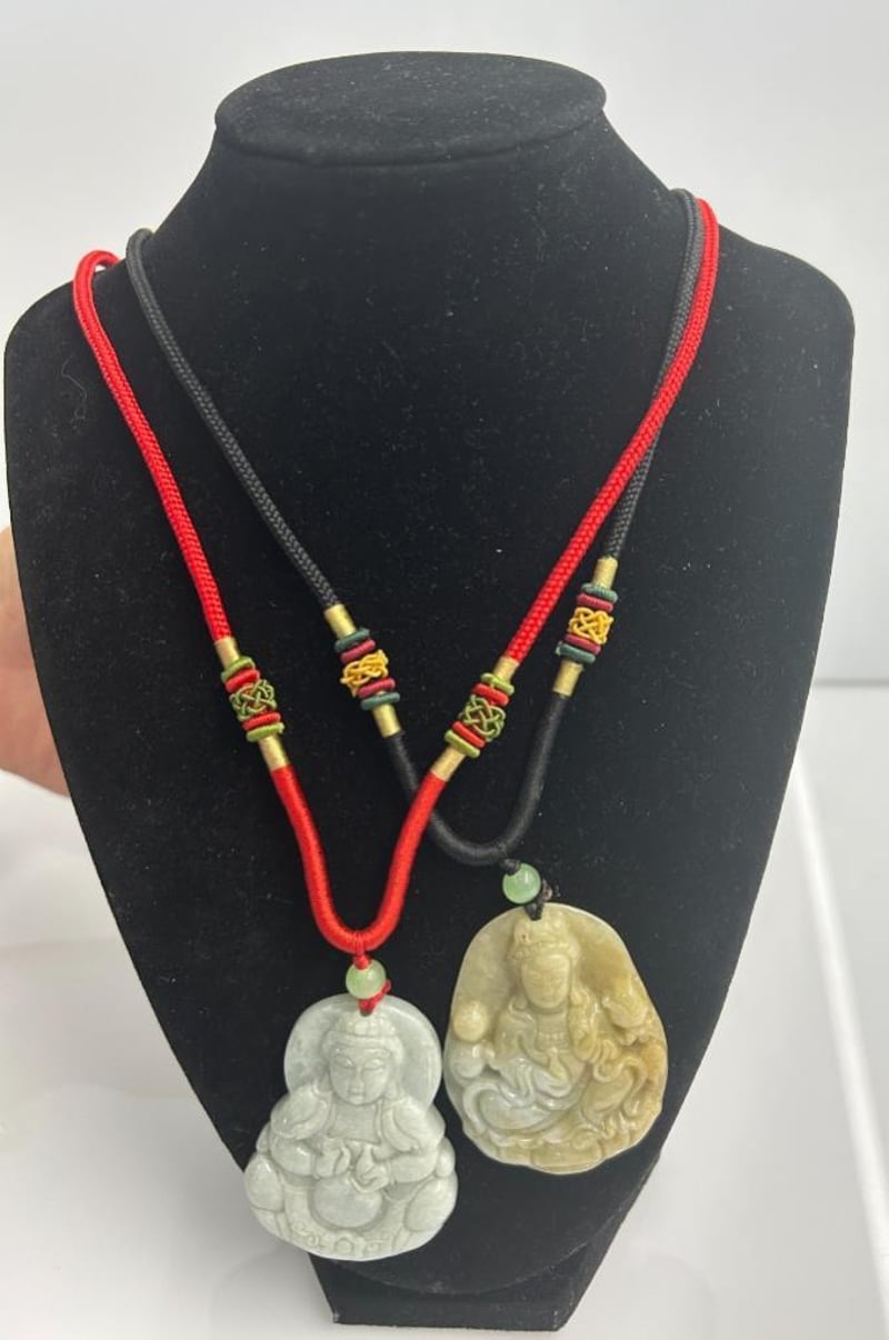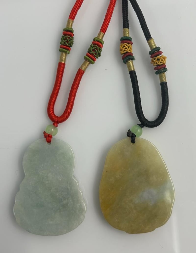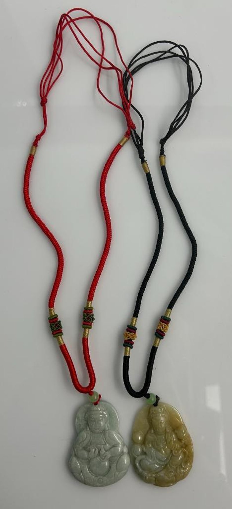 TWO-PIECE JADE PENDANT LOT, COMPRISING A PALE GREEN JADE BUDDHA PENDANT ON A RED WOVEN CORD AND A GOLDEN-GREEN JADE GUANYIN PENDANT ON A BLACK WOVEN CORD. EACH FEATURES DECORATIVE THREADED BEAD DETAILS IN RED, GREEN, AND GOLD TONES, WITH SMOOTH POLISHED SURFACES AND NATURAL COLOUR VARIATIONS THROUGHOUT THE JADE. BOTH PIECES EXHIBIT FINE HAND-CARVED DETAILING AND INCLUSIONS CHARACTERISTIC OF NATURAL JADE, SYMBOLISING PEACE, PROTECTION, AND PROSPERITY.Condition: Good - Refer To Images997339+82