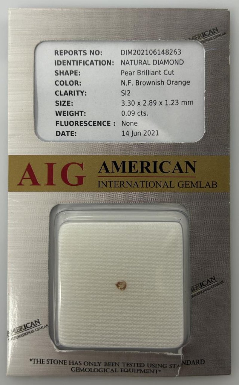 0.09CT NATURAL FANCY BROWNISH ORANGE DIAMOND, PEAR BRILLIANT CUT WITH SI2 CLARITY, MEASURING 3.30 X 2.89 X 1.23MM. CERTIFIED BY AIG AMERICAN INTERNATIONAL GEMLAB, REPORT DATED 14 JUNE 2021.