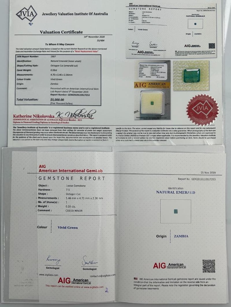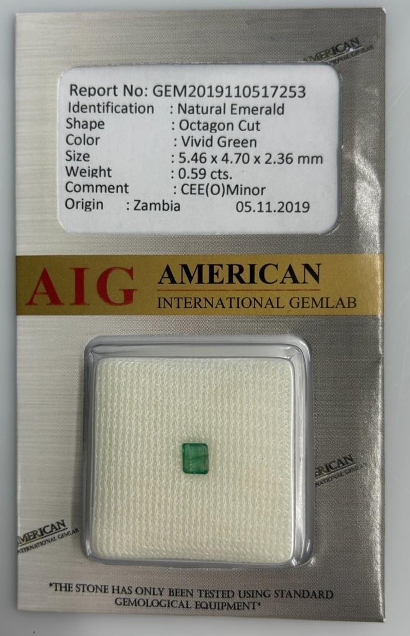 0.59CT NATURAL EMERALD (ZAMBIAN ORIGIN) THIS EXQUISITE OCTAGON-CUT NATURAL EMERALD MEASURES APPROXIMATELY 5.46 × 4.70 × 2.36MM AND DISPLAYS A VIVID GREEN HUE WITH STRIKING BRILLIANCE. WITH A CLARITY CHARACTERISTIC OF CE(E0) MINOR, THIS GEM EXEMPLIFIES FINE TRANSPARENCY AND COLOUR INTENSITY, ORIGIN: ZAMBIA, LABORATORY CERTIFICATION: AIG AMERICAN INTERNATIONAL GEMLAB (REPORT NO. GEM2019110517253) RETAIL REPLACEMENT VALUE: AUD $5,000Condition: Good - Refer To Images997339+140