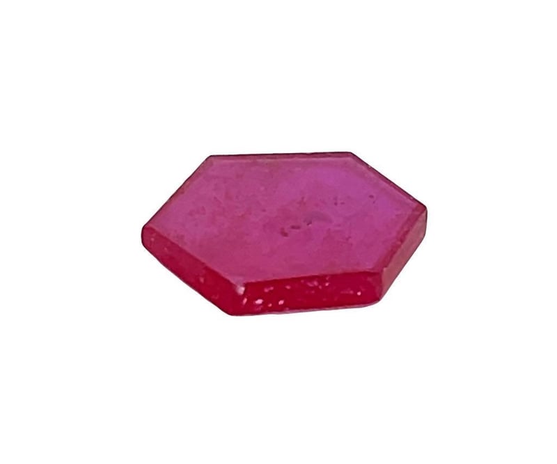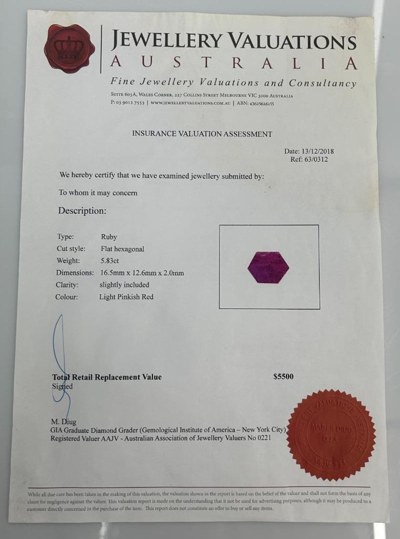5.83CT LIGHT PINKISH RED NATURAL RUBY, FLAT HEXAGONAL CUT MEASURING 16.5 X 12.6 X 2.0MM WITH SLIGHTLY INCLUDED CLARITY. INCLUDES VALUATION CERTIFICATE $5,500.00.