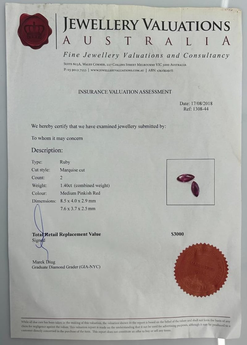1.40CT TOTAL WEIGHT MEDIUM PINKISH RED NATURAL RUBIES, MARQUISE CUT MEASURING 8.5 X 4.0 X 2.9MM AND 7.6 X 3.7 X 2.5MM. INCLUDES VALUATION CERTIFICATE $3,000.00.Condition: Good - Refer To Images997339+111